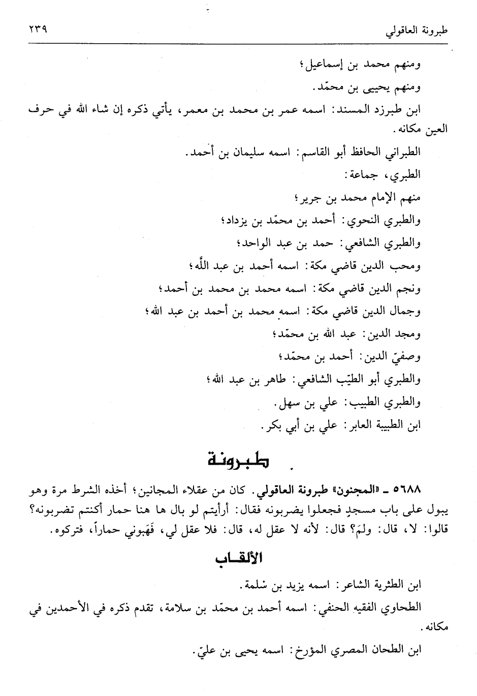 الطَّبَرِيّ جمَاعَة مِنْهُم الإِمَام مُحَمَّد بن جرير والطبري النَّحْوِيّ أَحْمد بن مُحَمَّد بن يزْدَاد والطبري الشَّافِعِي حمد بن عبد الْوَاحِد ومحب الدّين قَاضِي مَكَّة اسْمه أَحْمد بن عبد الله وَنجم الدّين قَاضِي مَكَّة اسْمه مُحَمَّد بن مُحَمَّد بن أَحْمد وجمال الدّين قَاضِي مَكَّة اسْمه مُحَمَّد بن أَحْمد بن عبد الله ومجد الدّين عبد الله بن مُحَمَّد وصفي الدّين أَحْمد بن مُحَمَّد والطبري أَبُو الطّيب الشَّافِعِي طَاهِر بن عبد الله والطبري الطَّبِيب عَليّ بن سهل