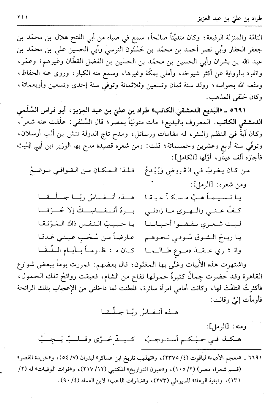طراد بن عَليّ بن عبد الْعَزِيز أَبُو فراس السّلمِيّ الدِّمَشْقِي الْكَاتِب الْمَعْرُوف بالبديع مَاتَ مُتَوَلِّيًا بمص قَالَ السلَفِي علقت عَنهُ شعرًا وَكَانَ آيَة فِي النّظم والنثر لَهُ مقامات ورسائل ومدح تَاج الدولة تتش بن ألب أرسلان وَتُوفِّي سنة أَربع وَعشْرين وَخَمْسمِائة قلت وَمن شعره قصيدة مدح بهَا الْوَزير ابْن أبي اللَّيْث فَأَجَازَهُ ألف دِينَار أَولهَا