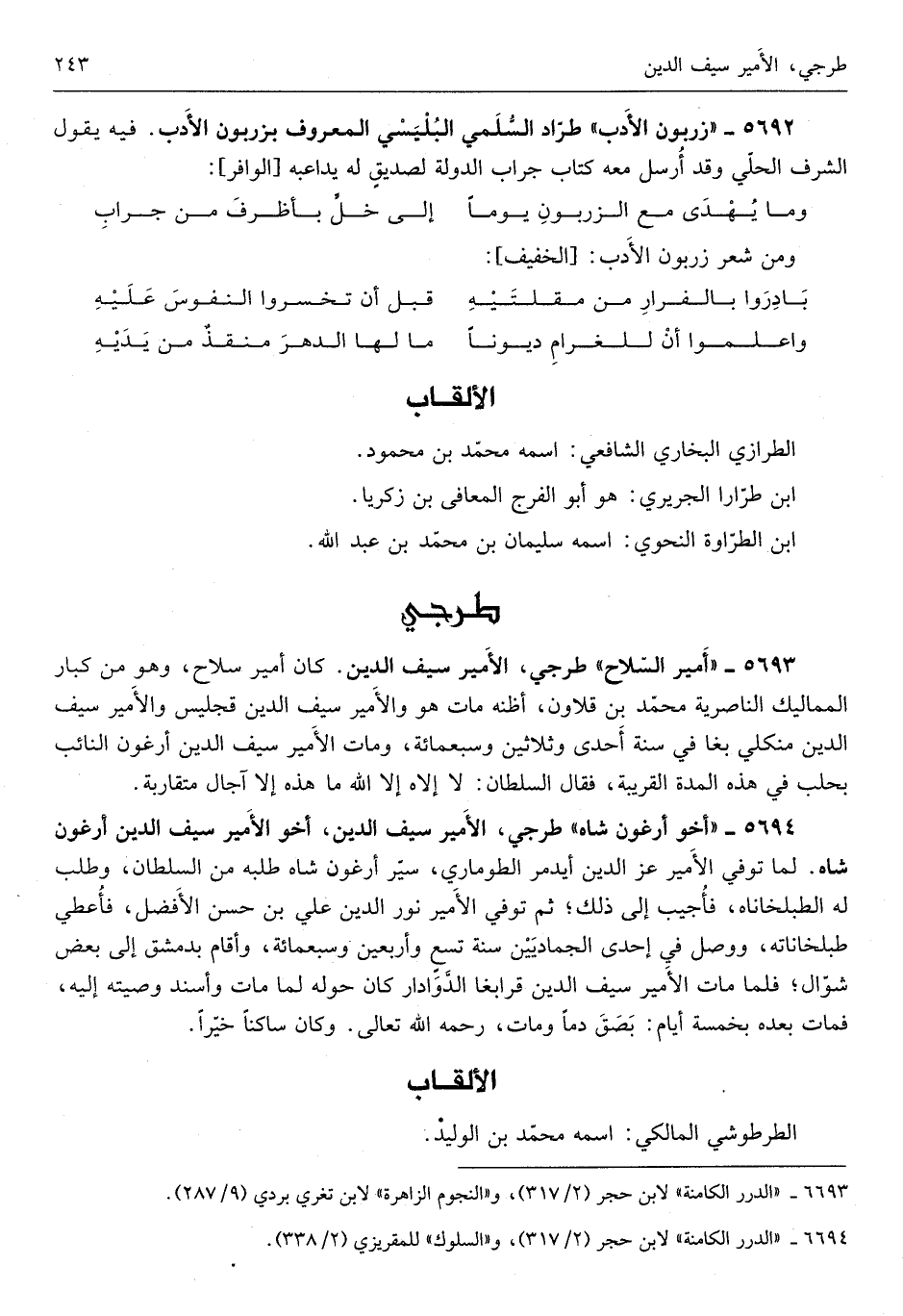 طرجي الْأَمِير سيف الدّين كَانَ أَمِير سلَاح وَهُوَ من كبار المماليك الناصرية مُحَمَّد بن قلاون أَظُنهُ مَاتَ هُوَ والأمير سيف الدّين قجليس والأمير سيف الدّين منكلي بغا فِي سنة إِحْدَى وَثَلَاثِينَ وَسَبْعمائة وَمَات الْأَمِير سيف الدّين أرغون النَّائِب بحلب فِي هَذِه الْمدَّة الْقَرِيبَة فَقَالَ السُّلْطَان لَا إِلَه إِلَّا الله مَا هَذِه إِلَّا آجال مُتَقَارِبَة