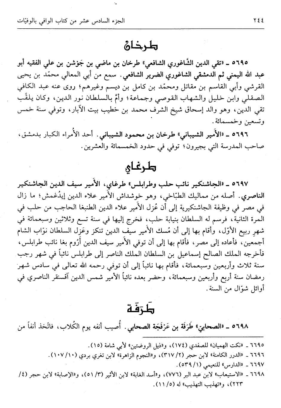 طرغاي الْأَمِير سيف الدّين الجاشنكير الناصري اصله من مماليك الطباخي وَهُوَ خوشداش الْأَمِير عَلَاء الدّين إيدغمش مَا زَالَ فِي مصر فِي وَظِيفَة الجاشنكيرية إِلَى أَن عزل الْأَمِير عَلَاء الدّين الطنبغا الْحَاجِب من حلب فِي الرمة الثَّانِيَة فرسم لَهُ السُّلْطَان بنيابة حلب فَخرج إِلَيْهَا فِي سنة تسع وَثَلَاثِينَ وَسَبْعمائة فِي شهر ربيع الأول وَأقَام بهَا إِلَى أَن مسك الْأَمِير سيف الدّين تنكز وعزل السُّلْطَان نواب الشَّام أَجْمَعِينَ فَأَعَادَهُ إِلَى مصر فَأَقَامَ بهَا إِلَى أَن توفّي الْأَمِير سيف الدّين أروم بغا نَائِب طرابلس فَأخْرجهُ الْملك الصَّالح إِسْمَاعِيل ابْن السُّلْطَان الْملك النَّاصِر إِلَى طرابلس نَائِبا فِي شهر رَجَب سنة ثَلَاث وَأَرْبَعين وَسَبْعمائة فَأَقَامَ بهَا نَائِبا إِلَى أَن توفّي رَحمَه الله تَعَالَى فِي سادس شهر رَمَضَان سنة ارْبَعْ وَأَرْبَعين وَسَبْعمائة وَحضر بعده نَائِبا الْأَمِير شمس الدّين آقسنقر الناصري فِي أَوَائِل شَوَّال من السّنة