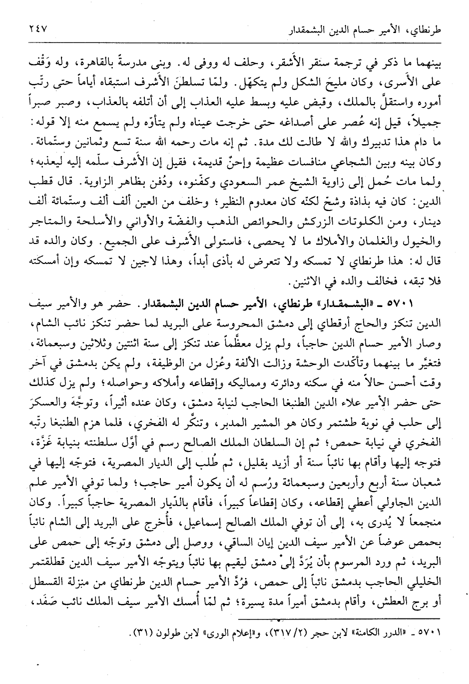 طرنطاي الْأَمِير حسام الدّين البشمقدار حضر هُوَ والأمير سيف الدّين تنكز والحاج أرقطاي إِلَى دمشق المحروسة على الْبَرِيد لما حضر تنكز نَائِب الشَّام وَصَارَ الْأَمِير حسام الدّين حاجباً وَلم يزل مُعظما عِنْد تنكز إِلَى سنة اثْنَتَيْنِ وَثَلَاثِينَ وَسَبْعمائة فَتغير مَا بَينهمَا وتأكدت الوحشة وزالت الألفة وعزل من الْوَظِيفَة وَلم يكن بِدِمَشْق فِي آخر وَقت أحسن حَالا مِنْهُ فِي سكنه ودائرته ومماليكه وإقطاعه وأملاكه وحواصله وَلم يزل كَذَلِك حَتَّى حضر الْأُمِّي عَلَاء)