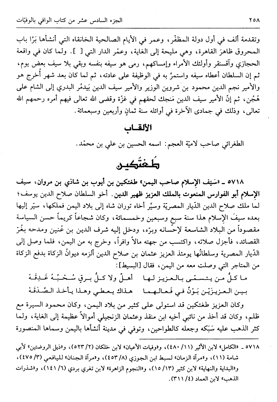 طغتكين بن أَيُّوب بن شاحذي بن مَرْوَان سيف الْإِسْلَام أَبُو الفوارس المنعوت بِالْملكِ الْعَزِيز ظهير الدّين أَخُو السُّلْطَان صَلَاح الدّين يُوسُف لما ملك صَلَاح الدّين الديار المصرية وسير أَخَاهُ توران شاه إِلَى بِلَاد الْيمن فملكها سير إِلَيْهَا بعده سيف الْإِسْلَام هَذَا سنة سبع ومسبعين وَخَمْسمِائة وَكَانَ شجاعاً كَرِيمًا حسن السياسة مَقْصُودا من الْبِلَاد الشاسعة لإحسانه وبره وَدخل إِلَيْهِ شرف الدّين ابْن عنين ومدحه بغر القصائد فأجزل صلَاته واكتسب من جِهَته مَالا وافراً وَخرج بِهِ من الْيمن فَلَمَّا صَار إِلَى الديار المصرية وسلطانها يَوْمئِذٍ الْعَزِيز عُثْمَان ابْن صَلَاح الدّين ألزمهُ ديوَان الزَّكَاة بِدفع الزَّكَاة من المتاجر الَّتِي وصلت مَعَه من الْيمن فَقَالَ