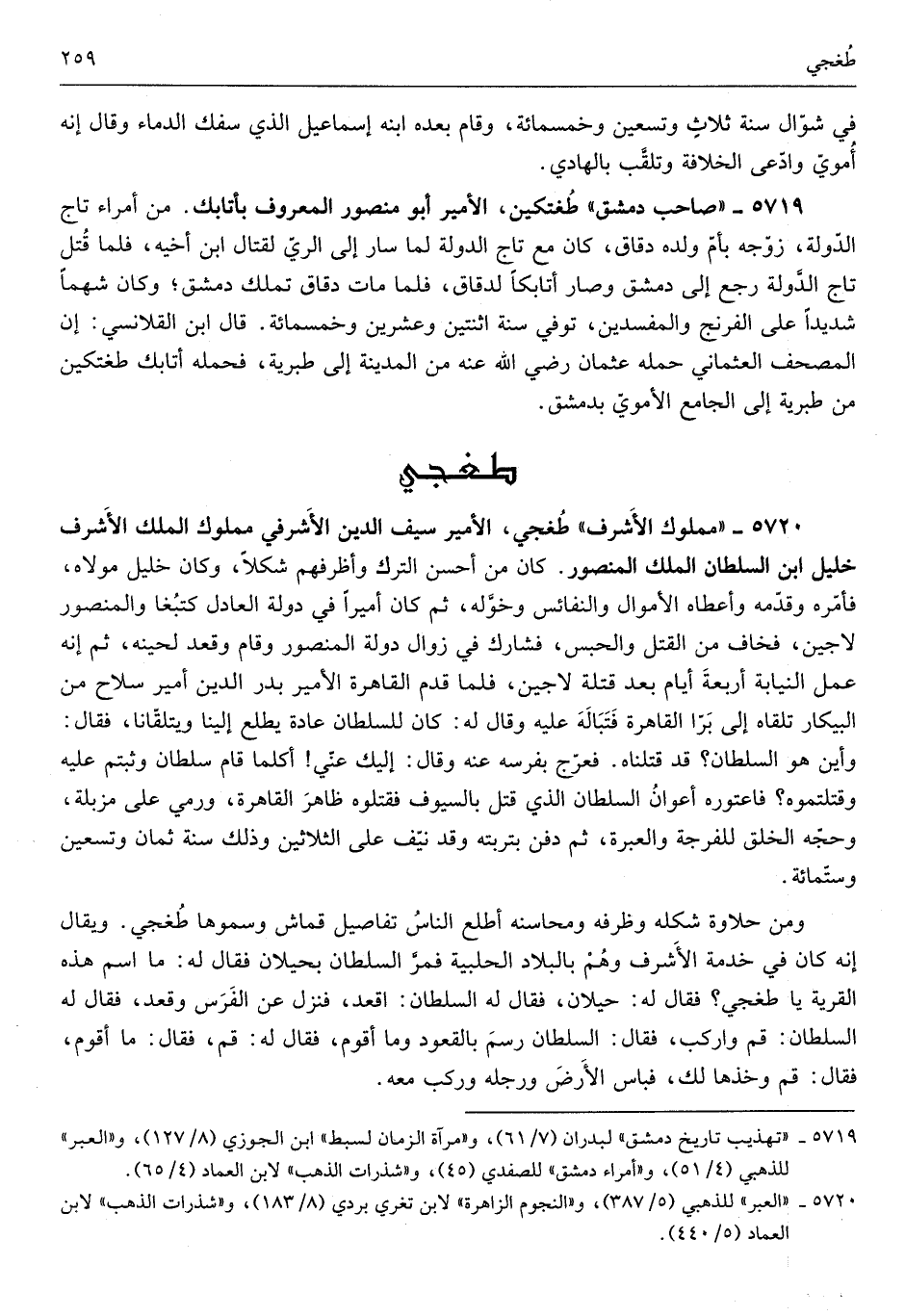 طغتكين الْأَمِير أَبُو مَنْصُور الْمَعْرُوف بأتابك من أُمَرَاء تَاج الدولة زوجه بِأم وَلَده دقاق كَانَ مَعَ تَاج الدولة لما سَار إِلَى الرّيّ لقِتَال ابْن أَخِيه فَلَمَّا قتل تَاج الدولة رَجَعَ إِلَى دمشق وَصَارَ أتابكاً لدقاق فَلَمَّا مَاتَ دقاق تملك دمشق وَكَانَ شهماً شَدِيدا على الفرنج والمفسدين توفّي سنة اثْنَتَيْنِ وَعشْرين وَخَمْسمِائة قَالَ ابْن القلانسي إِن الْمُصحف العثماني حمله عُثْمَان رَضِي الله عَنهُ من الْمَدِينَة إِلَى كبرية فَحَمله أتابك طغتكين من طبرية إِلَى الْجَامِع الْأمَوِي بِدِمَشْق