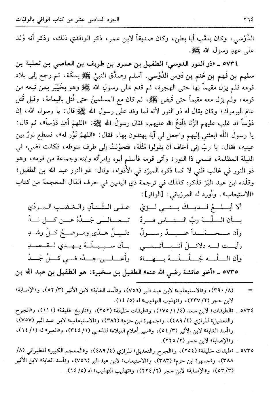 طفيل بن عَمْرو بن طريف بن العَاصِي بن ثَعْلَبَة بن سليم بن فهم بن غنم ابْن دوس الدوسي أسلم وَصدق النَّبِي صلى الله عَلَيْهِ وَسلم بِمَكَّة ثمَّ رَجَعَ إِلَى بِلَاد قومه فَلم يزل مُقيما بهَا حَتَّى الْهِجْرَة ثمَّ قدم على رَسُول الله صلى الله عَلَيْهِ وَسلم وَهُوَ بِخَيْبَر بِمن تبعه من قومه وَلم يزل مَعَه مُقيما حَتَّى قبض صلى الله عَلَيْهِ وَسلم ثمَّ كَانَ مَعَ الْمُسلمين حَتَّى قتل بِالْيَمَامَةِ وَقيل قتل عَام اليرموك وَكَانَ يُقَال لَهُ ذُو النُّور لِأَنَّهُ لما وَفد على رَسُول الله صلى الله عَلَيْهِ وَسلم قَالَ يَا رَسُول الله إِن دوساً قد غلب عَلَيْهِم الزِّنَا فَادع الله عَلَيْهِم فَقَالَ رَسُول الله صلى الله عَلَيْهِ وَسلم اللَّهُمَّ اهذ دوساً ثمَّ قَالَ يَا رَسُول الله ابعثني إِلَيْهِم وَاجعَل لي آيه يَهْتَدُونَ بهَا فَقَالَ اللَّهُمَّ نور لَهُ فسطع نور بَين عَيْنَيْهِ فَقَالَ يَا رب إِنِّي أَخَاف أَن يَقُولُوا مثلَة فتحولت إِلَى طرف سَوْطه فَكَانَت تضيء فِي اللَّيْلَة الْمظْلمَة فَسُمي ذَا النُّور وأتى قومه فَاسْلَمْ أَبوهُ وَامْرَأَته وَابْنه وَجَمَاعَة من قومه وَهُوَ ذُو النُّور فِي غَالب ظَنِّي لَا كَمَا ذكره الْمبرد فِي الأذواء وَقَالَ ذُو النورن عبد الله بن الطُّفَيْل وقلده ابْن عبد الْبر فَذكره كَذَلِك فِي تَرْجَمَة ذِي الْيَدَيْنِ فِي حرف الذَّال الْمُعْجَمَة من كتاب الِاسْتِيعَاب وَأورد لَهُ المرزباني