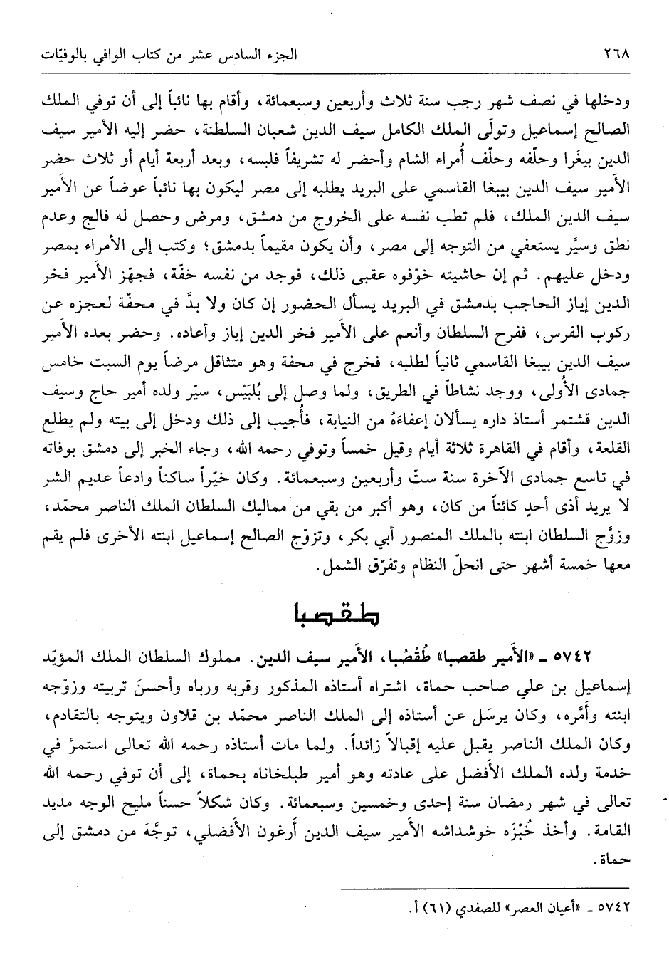 طقصبا الْأَمِير سيف الدّين مَمْلُوك السُّلْطَان الْملك الْمُؤَيد إِسْمَاعِيل بن عَليّ صَاحب حماة اشْتَرَاهُ أستاذه الْمَذْكُور وقربه ورباه وَأحسن تَرْبِيَته وزوجه ابْنَته وَأمره وَكَانَ يُرْسل عَن أستاذه إِلَى الْملك النَّاصِر مُحَمَّد بن قلاون وَيتَوَجَّهُ بالتقادم وَكَانَ الْملك النَّاصِر يقبل عَلَيْهِ إقبالاً زَائِدا وَلما مَاتَ أستاذه رَحمَه الله تَعَالَى اسْتمرّ فِي خدمَة وَلَده الْملك الْأَفْضَل على عَادَته وَهُوَ أَمِير طلبخاناه بحماة إِلَى أَن توفّي رَحمَه الله تَعَالَى فِي شهر رَمَضَان سنة إِحْدَى وَخمسين وَسَبْعمائة وَكَانَ شكلاً حسنا مليح الْوَجْه مديد الْقَامَة وَأخذ خبزه خوشداشه الْأَمِير سيف الدّين أرغون الأفضلي توجه من دمشق إِلَى حماة