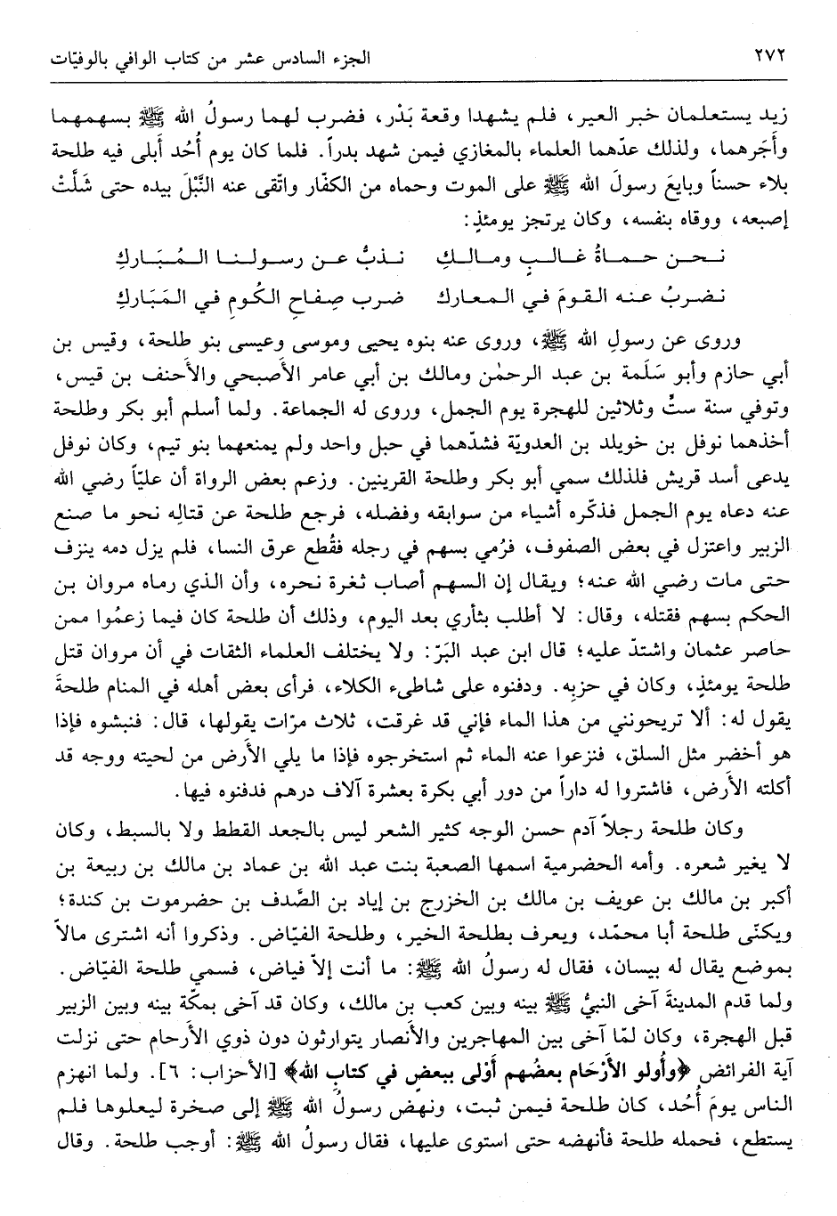زيد يستعلمان خبر العير فَلم يشْهد وقْعَة بدر فَضرب لَهما رَسُول الله صلى الله عَلَيْهِ وَسلم بسهمهما وأجرهما وَلذَلِك عدهما الْعلمَاء بالمغازي فِيمَن شهد بَدْرًا فَلَمَّا كَانَ يَوْم أحد أبلى فِيهِ طَلْحَة بلَاء حسنا وَبَايع رَسُول الله صلى الله عَلَيْهِ وَسلم على الْمَوْت وحماه من الْكفَّار وَاتَّقَى عَنهُ النبل بِيَدِهِ حَتَّى شلت إصبعه ووقاه بِنَفسِهِ وَكَانَ يرتجز يَوْمئِذٍ