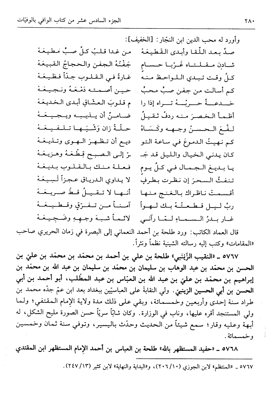 طَلْحَة بن عَليّ بن أَحْمد بن مُحَمَّد بن مُحَمَّد بن عَليّ بن الْحسن بن مُحَمَّد ابْن عبد الْوَهَّاب بن مُحَمَّد بن سُلَيْمَان بن عبد الله بن مُحَمَّد بن إِبْرَاهِيم بن مُحَمَّد بن عَليّ بن عبد الله بن الْعَبَّاس بن عبد الْمطلب أَبُو احْمَد ابْن أبي الْحسن ابْن أبي الْحُسَيْن الزَّيْنَبِي ولي النقابة على العباسيين بِبَغْدَاد بعد ابْن عَم جده مُحَمَّد بن طراد سنة إِحْدَى وَأَرْبَعين وَخَمْسمِائة وَبَقِي على ذَلِك مُدَّة ولَايَة الإِمَام المقتفي وَلما ولي المستنجد أقره عَلَيْهَا وناب فِي الوزارة وَكَانَ شَابًّا سرياً حسن الصُّورَة مليح الشكل لَهُ أبهة وَعَلِيهِ وقار سمع شَيْئا من الحَدِيث وَحدث باليسير وَتُوفِّي سنة ثَمَان وَخمسين وَخَمْسمِائة 5768