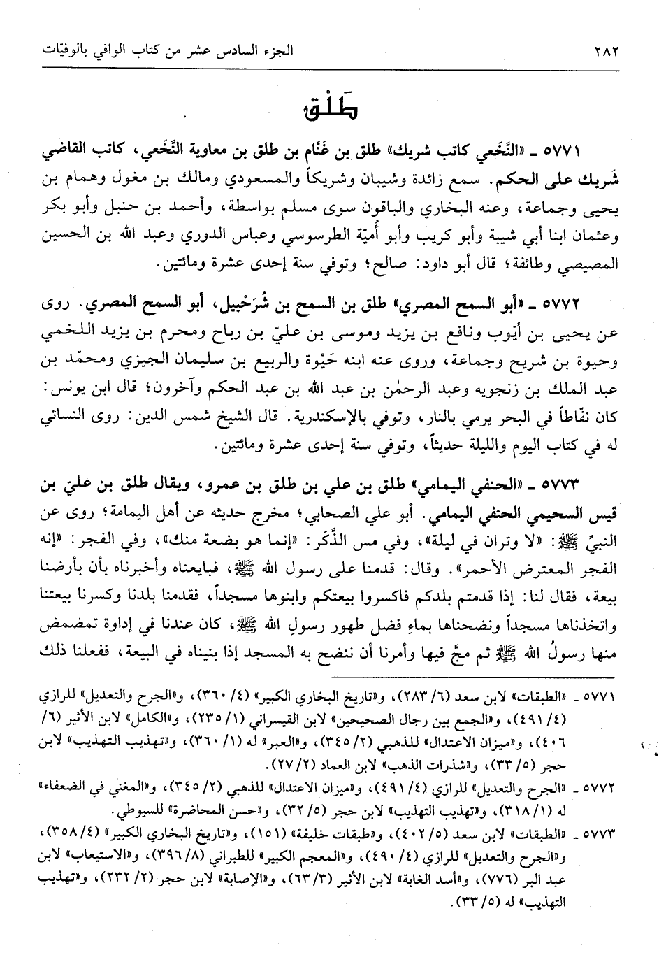 طلق بن غَنَّام بن طلق بن مُعَاوِيَة النَّخعِيّ كَاتب القَاضِي شريك على الحكم سمع زَائِدَة وشيبان وشريكاً والمسعودي وَمَالك بن مغول وَهَمَّام بن يحيى وَجَمَاعَة وَعنهُ البُخَارِيّ وَالْبَاقُونَ سوى مُسلم بِوَاسِطَة وَأحمد بن حَنْبَل وَأَبُو بكر وَعُثْمَان ابْنا أبي شيبَة وَأَبُو كريب وَأَبُو أُميَّة الطرسوسي وعباس الدوري وَعبد الله بن الْحُسَيْن المصِّيصِي وَطَائِفَة قَالَ أَبُو دَاوُد صَالح وَتُوفِّي سنة إِحْدَى عشرَة وَمِائَتَيْنِ 5772
