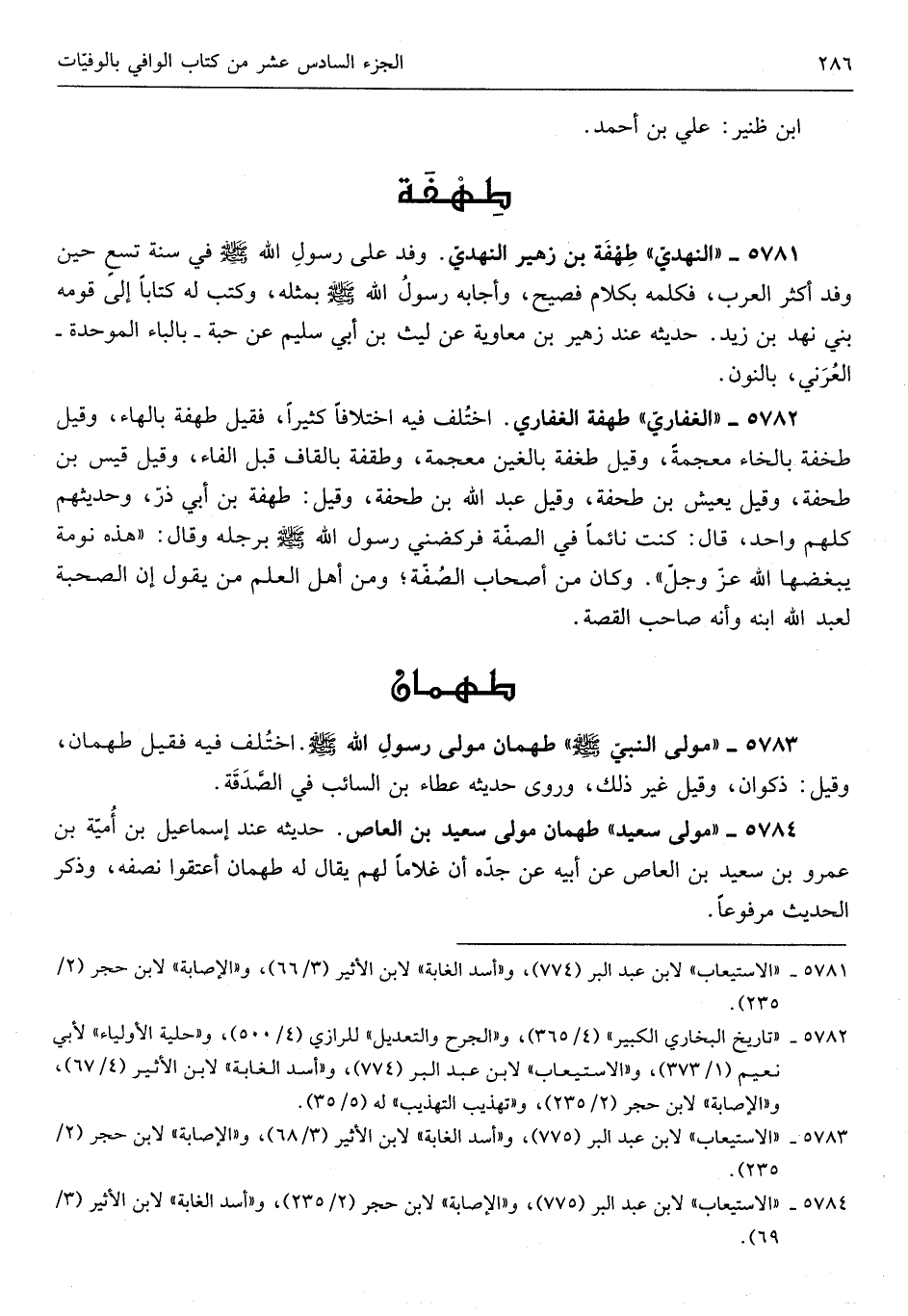 طهفة بن زُهَيْر النَّهْدِيّ وَفد على رَسُول الله صلى الله عَلَيْهِ وَسلم فِي سنة تسع حِين وَفد أَكثر الْعَرَب فَكَلمهُ بِكَلَام فصيح وأجابه رَسُول الله صلى الله عَلَيْهِ وَسلم بِمثلِهِ وَكتب لَهُ كتابا إِلَى قومه بني نهد بن زيد حَدِيثه عِنْد زُهَيْر بن مُعَاوِيَة عَن لَيْث بن أبي سليم عَن حَبَّة بِالْبَاء الْمُوَحدَة العرني بالنُّون 5782