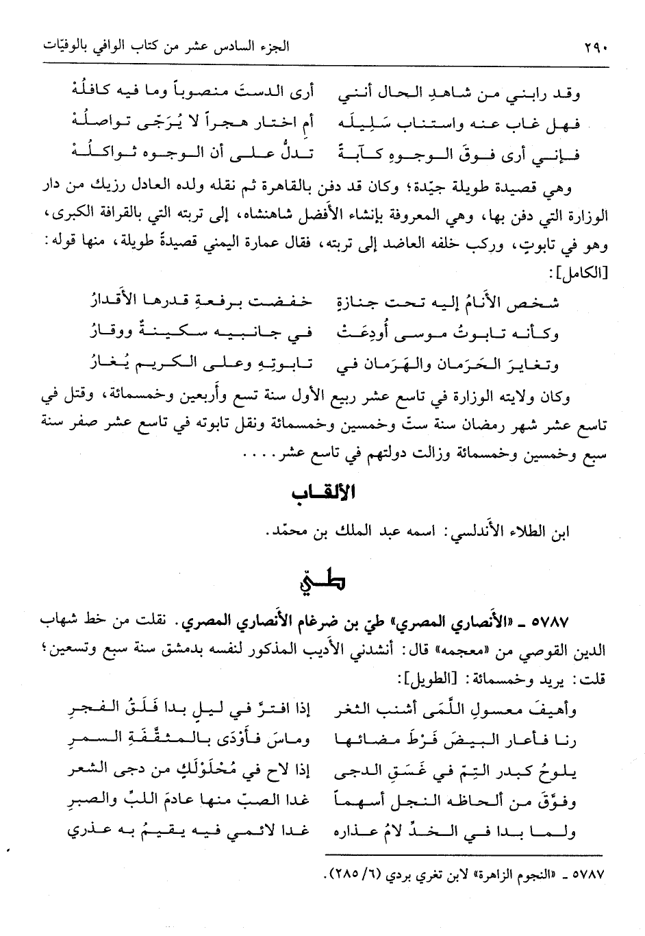 طي بن ضرغام الْأنْصَارِيّ الْمصْرِيّ نقلت من خطّ شهَاب الدّين القوصي من مُعْجَمه قَالَ أَنْشدني الأديب الْمَذْكُور لنَفسِهِ بِدِمَشْق سنة سبع وَتِسْعين قلت يُرِيد وَخَمْسمِائة الطَّوِيل