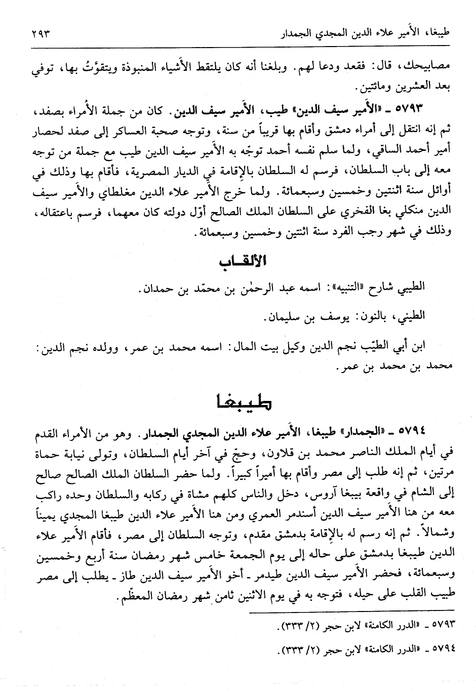 طيبغا الْأَمِير عَلَاء الدّين المجدي الجمدار وَهُوَ من الْأُمَرَاء الْقدَم فِي أَيَّام الْملك النَّاصِر مُحَمَّد بن قلاون وَحج فِي آخر أَيَّام السُّلْطَان وَتَوَلَّى نِيَابَة حماة مرَّتَيْنِ ثمَّ إِنَّه طلب إِلَى مصر وَأقَام بهَا أَمِيرا كَبِيرا وَلما حضر السُّلْطَان الْملك الصَّالح صَالح إِلَى الشَّام فِي وَاقعَة بيبغا آروس دخل وَالنَّاس كلهم مشَاة فِي ركابه وَالسُّلْطَان وَحده رَاكب مَعَه من هُنَا الْأَمِير سيف الدّين أسندمر الْعمريّ وَمن هُنَا الْأَمِير عَلَاء الدّين طيبغا المجدي يَمِينا وَشمَالًا ثمَّ إِنَّه رسم لَهُ بِالْإِقَامَةِ بِدِمَشْق مقدم وَتوجه السُّلْطَان إِلَى مصر فَأَقَامَ الْأَمِير عَلَاء الدّين طيبغا بِدِمَشْق على حَاله إِلَى يَوْم الْجُمُعَة خَامِس شهر رَمَضَان سنة أَربع وَخمسين وَسَبْعمائة فَحَضَرَ الْأَمِير سيف الدّين طيدمر أَخُو الْأَمِير سيف الدّين طاز يطْلب إِلَى مصر طَبِيب الْقلب على حيله فَتوجه بِهِ فِي يَوْم الِاثْنَيْنِ ثامن شهر رَمَضَان الْمُعظم