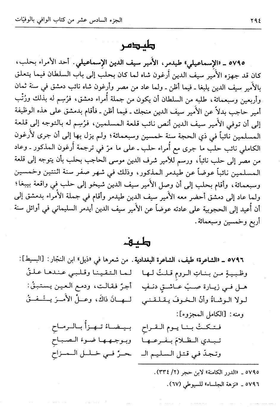 طيدمر الْأَمِير سيف الدّين الْإِسْمَاعِيلِيّ أحد الْأُمَرَاء بحلب كَانَ قد جهزه الْأَمِير سيف الدّين أرغون شاه لما كَانَ بحلب إِلَى بَاب السُّلْطَان فِيمَا يتَعَلَّق بالأمير سيف الدّين يلبغا فِيمَا أَظن وَلما عَاد من مصر وأرغون شاه نَائِب دمشق فِي سنة ثَمَان وَأَرْبَعين وَسَبْعمائة طلبه من السُّلْطَان أَن يكون من جملَة أُمَرَاء دمشق فرسم لَهُ بذلك ورتب أَمِير حَاجِب بَدَلا عَن الْأَمِير سيف الدّين منجك فِيمَا أَظن فَأَقَامَ بِدِمَشْق على هَذِه الْوَظِيفَة إِلَى أَن توفّي الْأَمِير سيف الدّين أنص نَائِب قلعة الْمُسلمين فرسم لَهُ بالتوجه إِلَى قلعة الْمُسلمين نَائِبا فِي ذِي الْحجَّة سنة خمسين وَسَبْعمائة وَلم يزل بهَا إِلَى أَن جرى لأرغون الكاملي نَائِب حلب مَا جرى مَعَ أُمَرَاء حلب على مَا مر فِي تَرْجَمَة أرغون الْمَذْكُور وَعَاد من مصر إِلَى حلب نَائِبا ورسم للأمير شرف الدّين مُوسَى الْحَاجِب بحلب بِأَن يتَوَجَّه إِلَى قلعة الْمُسلمين نَائِبا عوضا عَن طيدمر الْمَذْكُور وَذَلِكَ فِي شهر صفر سنة اثْنَتَيْنِ وَخمسين وَسَبْعمائة وَأقَام بحلب إِلَى أَن وصل)