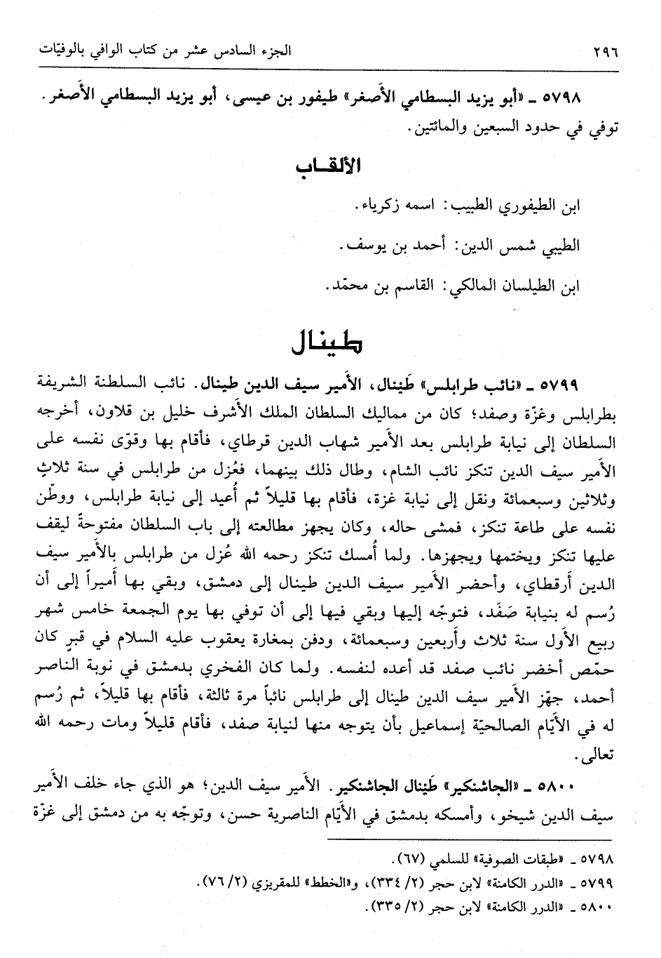 طينال الْأَمِير سيف الدّين طينال نَائِب السلطنة الشَّرِيفَة بطرابلس وغزة وصفد كَانَ من مماليك السُّلْطَان الْملك الْأَشْرَف خَلِيل بن قلاون أخرجه السُّلْطَان إِلَى نِيَابَة طرابلس بعد الْأَمِير شهَاب الدّين قرطاي فَأَقَامَ بهَا وقوى نَفسه على الْأَمِير سيف الدّين تنكز نَائِب الشَّام وَطَالَ ذَلِك بَينهمَا فعزل من طرابلس فِي سنة ثَلَاث وَثَلَاثِينَ وَسَبْعمائة وَنقل إِلَى نِيَابَة غَزَّة فَأَقَامَ بهَا قَلِيلا ثمَّ أُعِيد إِلَى نِيَابَة طرابلس ووطن نَفسه على طَاعَة تنكز فَمشى حَاله وَكَانَ يُجهز مطالعته إِلَى بَاب السُّلْطَان مَفْتُوحَة ليقف عَلَيْهَا تنكز ويختمها ويجهزها وَلما أمسك تنكز رَحمَه الله عزل من طرابلس بالأمير سيف الدّين أرقطاي وأحضر الْأَمِير سيف الدّين طينال إِلَى دمشق وَبَقِي بهَا أَمِيرا إِلَى أَن رسم لَهُ بنيابة صفد فَتوجه إِلَيْهَا وَبَقِي فِيهَا إِلَى أَن توفّي بهَا يَوْم الْجُمُعَة خَامِس شهر ربيع الأول سنة ثَلَاث وَأَرْبَعين وَسَبْعمائة وَدفن بمغارة يَعْقُوب عَلَيْهِ السَّلَام فِي قبر كَانَ حمص أَخْضَر نَائِب صفد قد أعده لنَفسِهِ وَلما كَانَ الفخري بِدِمَشْق فِي نوبَة النَّاصِر أَحْمد جهز الْأَمِير سيف الدّين طينال إِلَى طرابلس نَائِبا مرّة ثَالِثَة فَأَقَامَ بهَا قَلِيلا وَمَات رَحمَه الله تَعَالَى 5800