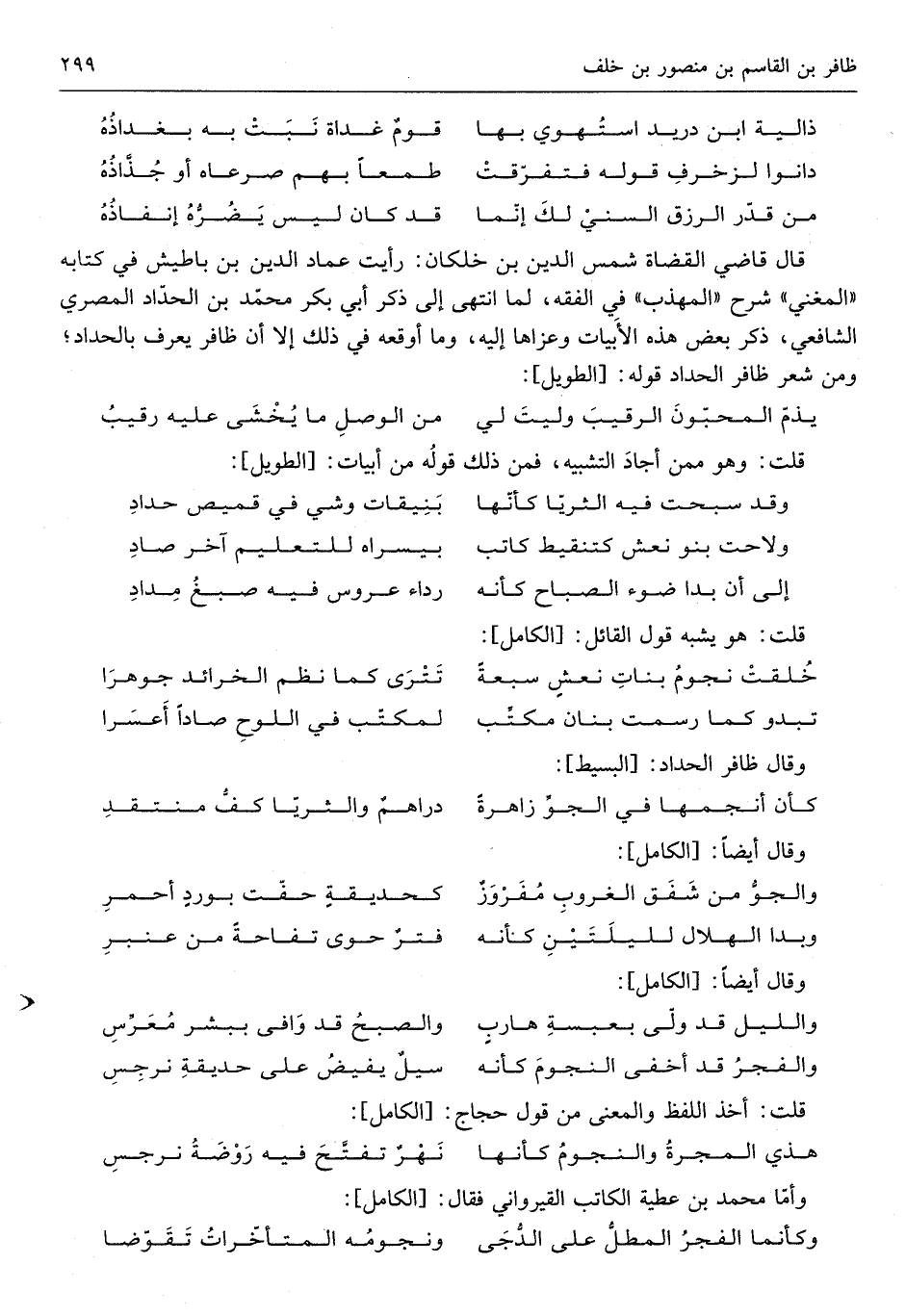 شرح الْمُهَذّب فِي الْفِقْه لما انْتهى إِلَى ذكر أبي بكر مُحَمَّد بن الْحداد الْمصْرِيّ الشَّافِعِي ذكر بعض هَذِه الأبيات وَعَزاهَا إِلَيْهِ وَمَا أوقعه فِي ذَلِك إِلَّا أَن ظافر يعرف بالحداد وَمن شعر ظافر الْحداد قَوْله الطَّوِيل