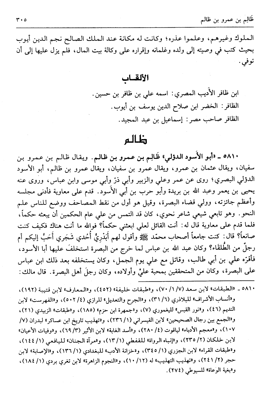 ظَالِم بن عَمْرو بن ظَالِم وَيُقَال ظَالِم بن عَمْرو بن سُفْيَان وَيُقَال عُثْمَان بن عَمْرو وَيُقَال عَمْرو بن سُفْيَان وَيُقَال عَمْرو بن ظَالِم أَبُو الْأسود الدؤَلِي الْبَصْرِيّ روى عَن عمر وَعلي وَالزُّبَيْر وَأبي ذَر وَأبي مُوسَى وَابْن عَبَّاس وروى عَنهُ يحيى بن يعمر وَعبد الله بن بُرَيْدَة وَأَبُو حَرْب ابْن أبي الْأسود قدم على مُعَاوِيَة فأدنى مَجْلِسه وَأعظم جائزته وَولي قَضَاء الْبَصْرَة وَقيل هُوَ أول من نقط الْمَصَاحِف وَوضع للنَّاس علم النَّحْو وَهُوَ تَابِعِيّ شيعي شَاعِر نحوي كَانَ قد التمس من عَليّ عَام الْحكمَيْنِ أَن يَبْعَثهُ حكما فَلَمَّا قدم على مُعَاوِيَة قَالَ لَهُ أَنْت الْقَائِل لعَلي ابعثني حكما فوَاللَّه مَا أَنْت هُنَاكَ فَكيف كنت صانعاً قَالَ كنت جَامعا أَصْحَاب مُحَمَّد صلى الله عَلَيْهِ وَسلم وَأَقُول لَهُم أبدري أحدي شجري أحب إِلَيْكُم أم رجل من الطُّلَقَاء وَكَانَ عبد الله بن عَبَّاس لما خرج من الْبَصْرَة اسْتخْلف عَلَيْهَا أَبَا الْأسود فأقره عَليّ بن أبي طَالب وَقَاتل مَعَ عَليّ يَوْم الْجمل وَكَانَ يستخلفه بعد ذَلِك ابْن عَبَّاس على الْبَصْرَة وَكَانَ من المتحققين بمحبة عَليّ وَأَوْلَاده وَكَانَ رجل أهل الْبَصْرَة قَالَ مَالك