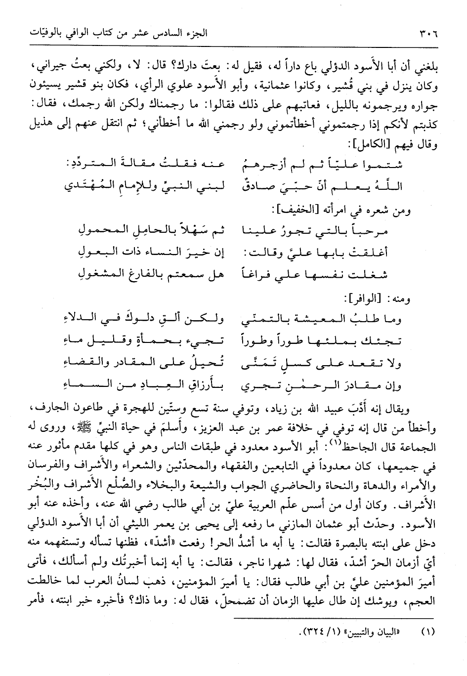 وَكَانُوا عثمانية وَأَبُو الْأسود علوي الرَّأْي فَكَانَ بني قُشَيْر يسيئون جواره ويرجمونه بِاللَّيْلِ فعاتبهم على ذَلِك فَقَالُوا مَا رجمناك وَلَكِن الله رجمك فَقَالَ كَذبْتُمْ لأنكم إِذا رجمتموني أخطأتموني وَلَو رجمني الله مَا أخطأني ثمَّ أنتقل عَنْهُم إِلَى هُذَيْل وَقَالَ فيهم الْكَامِل