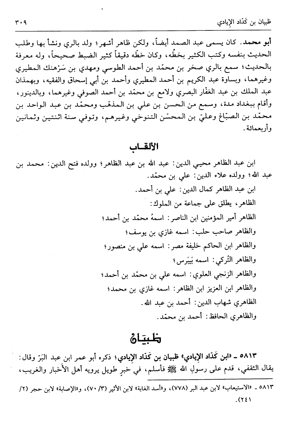ظبْيَان بن كداد الْإِيَادِي ذكره أَبُو عمر ابْن عبد الْبر وَقَالَ يُقَال الثَّقَفِيّ قدم على رَسُول الله صلى الله عَلَيْهِ وَسلم فَأسلم فِي خبر طَوِيل يرويهِ أهل الْأَخْبَار والغريب