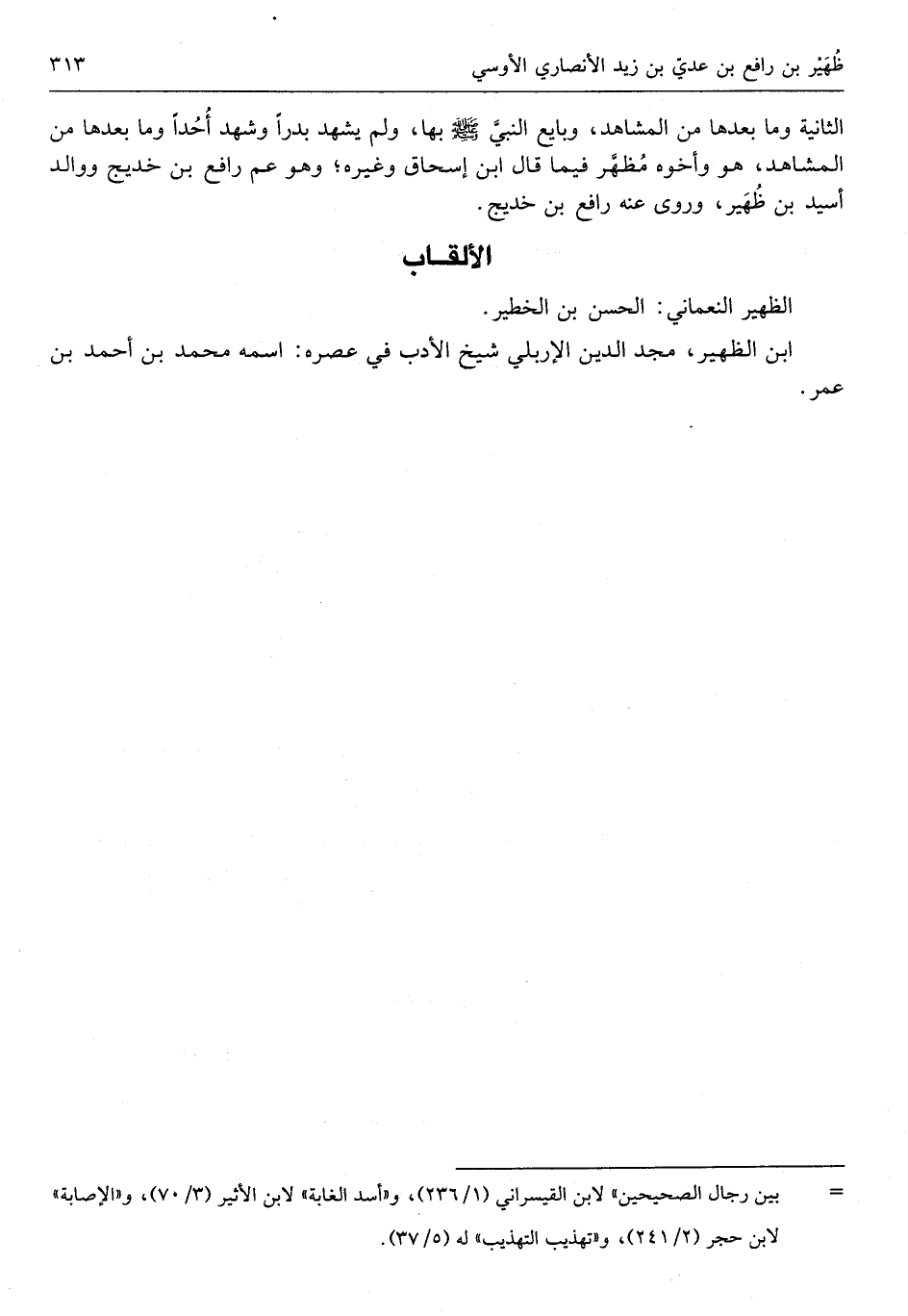 الثَّانِيَة وَمَا بعْدهَا من الْمشَاهد وَبَايع النَّبِي صلى الله عَلَيْهِ وَسلم بهَا وَلم يشْهد بَدْرًا وَشهد أحدا وَمَا بعْدهَا من الْمشَاهد هُوَ وَأَخُوهُ مظهر فِيمَا قَالَ ابْن إِسْحَاق وَغَيره وَهُوَ عَم رَافع بن خديج ووالد أسيد بن ظهير وروى عَنهُ رَافع بن خديج