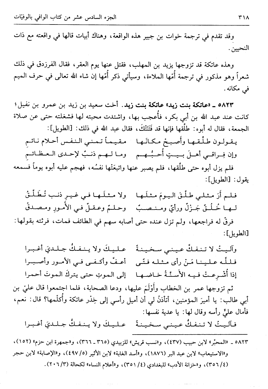 عَاتِكَة بنت زيد أُخْت سعيد بن زيد بن عَمْرو بن نُفيل كَانَت عِنْد عبد الله ابْن أبي بكر فأعجب بهَا واشتدت محبته لَهَا فشغلته حَتَّى عَن صَلَاة الْجُمُعَة فَقَالَ لَهُ أَبوهُ طَلقهَا فَإِنَّهَا قد فتنتك فَقَالَ عبد الله فِي ذَلِك الطَّوِيل