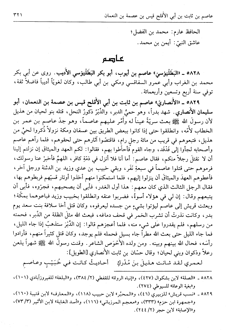 عَاصِم بن ثَابت بن أبي الأقلح قيس بن عصمَة بن النُّعْمَان أَبُو سُلَيْمَان الْأنْصَارِيّ شهد بَدْرًا وَهُوَ حمي الدبر والدبر ذُكُور النَّحْل قَتله بَنو لحيان من هُذَيْل لأنّ رَسُول الله صلى الله عَلَيْهِ وَسلم بعث سَرِيَّة عينا لَهُ وَأمر عَلَيْهِم عَاصِمًا وَهُوَ جد عَاصِم بن عمر بن الْخطاب لأمه وَانْطَلَقُوا حَتَّى إِذا كَانُوا بِبَعْض الطَّرِيق بَين عسفان وَمَكَّة نزولاً ذكرُوا لحي من هُذَيْل فتبعوهم فِي قريب من مائَة رجل رام فَاقْتَصُّوا آثَارهم حَتَّى لحقوهم فَلَمَّا رَآهُمْ عَاصِم وَأَصْحَابه لجأوا إِلَى فدفد وَجَاء الْقَوْم فأحاطوا بهم فَقَالُوا لكم الْعَهْد والميثاق إِن نزلتم إِلَيْنَا لَا نقْتل رجلا مِنْكُم فَقَالَ عَاصِم أما أَنا فَلَا أنزل فِي ذمَّة كَافِر اللَّهُمَّ فَأخْبر عَنَّا رَسُولك فَرَمَوْهُمْ حَتَّى قتلوا عَاصِمًا فِي سَبْعَة نفر وَبَقِي خبيب بن عدي وَزيد بن الدثنة وَرجل آخر فأعطوهم الْعَهْد والميثاق أَن ينزلُوا إِلَيْهِم فَلَمَّا استمكنوا مِنْهُم أخذُوا أوتار قسيهم فربطوهم بهَا فَقَالَ الرجل الثَّالِث الَّذِي كَانَ مَعَهم هَذَا أول الْغدر فَأبى أَن يصحبهم فجروه فَأبى أَن يتبعهُم وَقَالَ إِن لي فِي هَؤُلَاءِ أُسْوَة فَضربُوا عُنُقه وَانْطَلَقُوا بخبيب وَزيد فباعوهما بِمَكَّة وَبعثت قُرَيْش إِلَى عَاصِم ليؤتوا بِشَيْء من جسده ليعرفوه وَكَانَ قتل أَخا سلافة بنت سعد يَوْم بدر وَكَانَت نذرت أَن تشرب الْخمر فِي قحف دماغه فَبعث الله مثل الظلة من الدبر فحمته من رسلهم فَلم يقدروا على شَيْء مِنْهُ فَلَمَّا أعجزهم قَالُوا إِن الدبر ستذهب إِذا جَاءَ اللَّيْل فَمَا جَاءَ اللَّيْل حَتَّى بعث الله مَطَرا جَاءَ بسيل فَحَمله فَلم يُوجد وَكَانَ قتل كثيرا مِنْهُم فأرادوا رَأسه فحال الله بَينهم وَبَينه وَمن وَلَده الْأَحْوَص الشَّاعِر وقنت رَسُول الله صلى الله عَلَيْهِ وَسلم شهرا يلعن رعلاً وذكوان وَبني لحيان وَقَالَ حسان بن ثَابت الْأنْصَارِيّ الطَّوِيل)