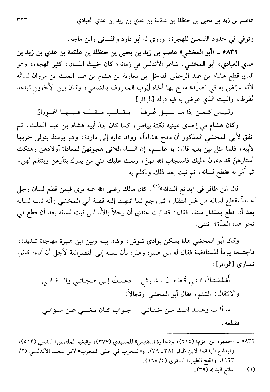 وَكَانَ هِشَام فِي إِحْدَى عَيْنَيْهِ نُكْتَة بَيَاض كَمَا كَانَ جد أَبِيه هِشَام بن عبد الْملك ثمَّ اتّفق لأبي المخشي الْمَذْكُور أَن مدح هشاما ووفد عَلَيْهِ فِي ماردة وَهُوَ يَوْمئِذٍ يتَوَلَّى حربها لِأَبِيهِ فَلَمَّا مثل بَين يَدَيْهِ قَالَ يَا عَاصِم إِن النِّسَاء اللَّاتِي هجوتهن لمعاداة أَوْلَادهنَّ وهتكت أستارهن قد دعون عَلَيْك فَاسْتَجَاب الله لَهُنَّ وَبعث عَلَيْك مني من يدْرك بثأرهن وينتقم لَهُنَّ ثمَّ أَمر بِهِ فَقطع لِسَانه ثمَّ نبت بعد ذَلِك وَتكلم بِهِ