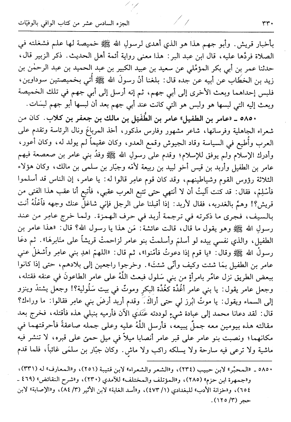 عَامر بن الطُّفَيْل بن مَالك بن جَعْفَر بن كلاب كَانَ من شعراء الْجَاهِلِيَّة وفرسانها شَاعِر مَشْهُور وَفَارِس مَذْكُور أَخذ المرباع ونال الرِّئَاسَة وَتقدم على الْعَرَب وَأطِيع فِي السياسة وقاد الجيوش وقمع الْعَدو وَكَانَ عقيماً لم يُولد لَهُ وَكَانَ أَعور وَأدْركَ الْإِسْلَام وَلم يوفق لِلْإِسْلَامِ وَقدم على رَسُول الله صلى الله عَلَيْهِ وَسلم وَفد بني عَامر بن صعصعة فيهم عَامر بن الطُّفَيْل وأربد بن قيس أَخُو لبيد بن ربيعَة لأمه وجبار بن سلمى بن مَالك وَكَانَ هَؤُلَاءِ الثَّلَاثَة رُؤُوس الْقَوْم وشياطينهم وَقد كَانَ قوم عَامر قَالُوا لَهُ يَا عَامر إِن النَّاس قد أَسْلمُوا فَأسلم فَقَالَ قد كنت آلَيْت أَن لَا أَنْتَهِي حَتَّى تتبع الْعَرَب عَقبي فأتبع أَنا عقب هَذَا الْفَتى من قُرَيْش وهم بالغدر بِهِ فَقَالَ لأربد إِذا أَقبلنَا على الرجل فَإِنِّي شاغل عَنْك وَجهه فَاعله أَنْت بِالسَّيْفِ فَجرى مَا ذكرته فِي تَرْجَمَة أَرْبَد فِي حرف الْهمزَة وَلما خرج عَامر من عِنْد رَسُول الله صلى الله)