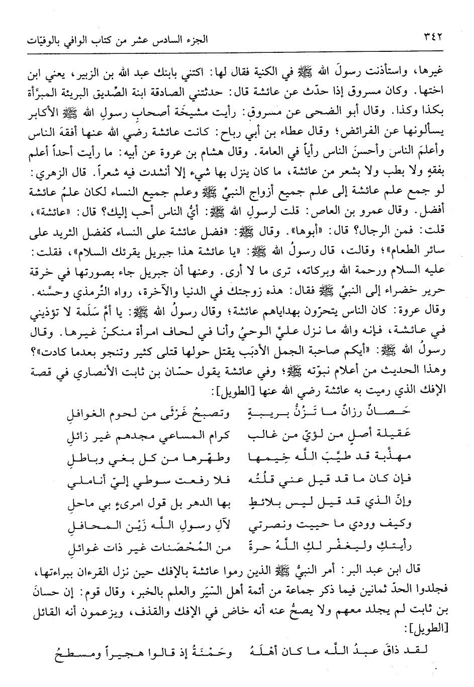 غَيرهَا واستأذنت رَسُول الله صلى الله عَلَيْهِ وَسلم فِي الكنية فَقَالَ لَهَا اكتني بابنك عبد الله بن الزبير يَعْنِي ابْن أُخْتهَا وَكَانَ مَسْرُوق إِذا حدث عَن عَائِشَة قَالَ حَدَّثتنِي الصادقة ابْنة الصّديق البريئة المبرأة بِكَذَا وَكَذَا وَقَالَ أَبُو الضُّحَى عَن مَسْرُوق رَأَيْت مشيخة أَصْحَاب رَسُول الله صلى الله عَلَيْهِ وَسلم الأكابر يسألونها عَن الْفَرَائِض وَقَالَ عَطاء بن أبي رَبَاح كَانَت عَائِشَة رَضِي الله عَنْهَا أفقه النَّاس وَأعلم النَّاس وَأحسن النَّاس رَأيا فِي الْعَامَّة وَقَالَ هِشَام بن عُرْوَة عَن أَبِيه مَا رَأَيْت أحدا أعلم بِفقه وَلَا بطب وَلَا بِشعر من عَائِشَة مَا كَانَ ينزل بهَا شَيْء إِلَّا أنشدت فِيهِ شعرًا قَالَ الزُّهْرِيّ لَو جمع علم عَائِشَة إِلَى علم جَمِيع أَزوَاج النَّبِي صلى الله عَلَيْهِ وَسلم وَعلم جَمِيع النِّسَاء لَكَانَ علم عَائِشَة أفضل وَقَالَ عَمْرو بن الْعَاصِ قلت لرَسُول الله صلى الله عَلَيْهِ وَسلم أَي النَّاس أحب إِلَيْك قَالَ عَائِشَة قلت فَمن الرِّجَال قَالَ أَبوهَا وَقَالَ صلى الله عَلَيْهِ وَسلم فضل عَائِشَة على النِّسَاء كفضل الثَّرِيد على سَائِر الطَّعَام وَقَالَت قَالَ رَسُول الله صلى الله عَلَيْهِ وَسلم يَا عَائِشَة هَذَا جِبْرِيل يُقْرِئك السَّلَام فَقلت عَلَيْهِ السَّلَام وَرَحْمَة الله وَبَرَكَاته ترى مَا لَا أرى وعنها أَن جِبْرِيل جَاءَ بصورتها فِي خرقَة حَرِير خضراء إِلَى النَّبِي صلى الله عَلَيْهِ وَسلم فَقَالَ هَذِه زَوجتك فِي الدُّنْيَا وَالْآخِرَة رَوَاهُ التِّرْمِذِيّ وَحسنه وَقَالَ عُرْوَة كَانَ النَّاس يتحرون بهداياهم عَائِشَة وَقَالَ رَسُول الله صلى الله عَلَيْهِ وَسلم يَا أم سَلمَة لَا تؤذيني فِي عَائِشَة فَإِنَّهُ وَالله مَا نزل عَليّ الْوَحْي وَأَنا فِي لِحَاف امْرَأَة مِنْكُن غَيرهَا وَقَالَ رَسُول الله صلى الله عَلَيْهِ وَسلم أَيّكُم صَاحِبَة الْجمل الأدبب يقتل حولهَا قَتْلَى كثير وتنجو بَعْدَمَا كَادَت وَهَذَا الحَدِيث من أَعْلَام نبوته صلى الله عَلَيْهِ وَسلم)