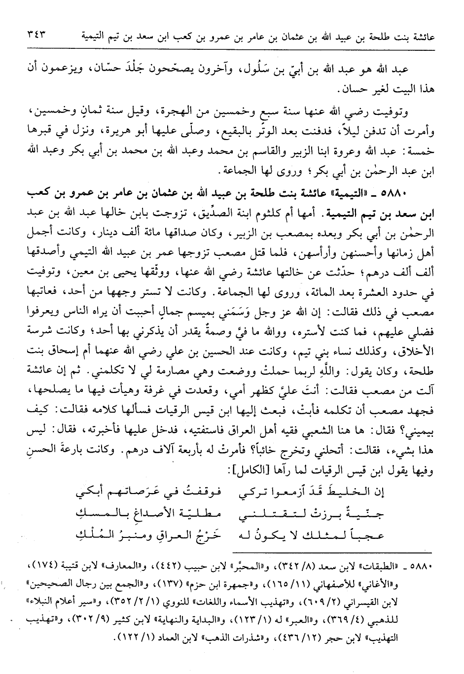 عَائِشَة بنت طَلْحَة بن عبيد الله بن عُثْمَان بن عَامر بن عَمْرو بن كَعْب ابْن سعد بن تيم التيمية أمهَا أم كُلْثُوم ابْنة الصّديق تزوجت بِابْن خالها عبد الله بن عبد الرَّحْمَن بن أبي بكر وَبعده بمصعب بن الزبير وَكَانَ صَدَاقهَا مائَة ألف دِينَار وَكَانَت أجمل أهل زمانها وأحسنهن وأرأسهن فَلَمَّا قتل مُصعب تزَوجهَا عمر بن عبيد الله التَّيْمِيّ وَأصْدقهَا ألف ألف دِرْهَم حدثت)