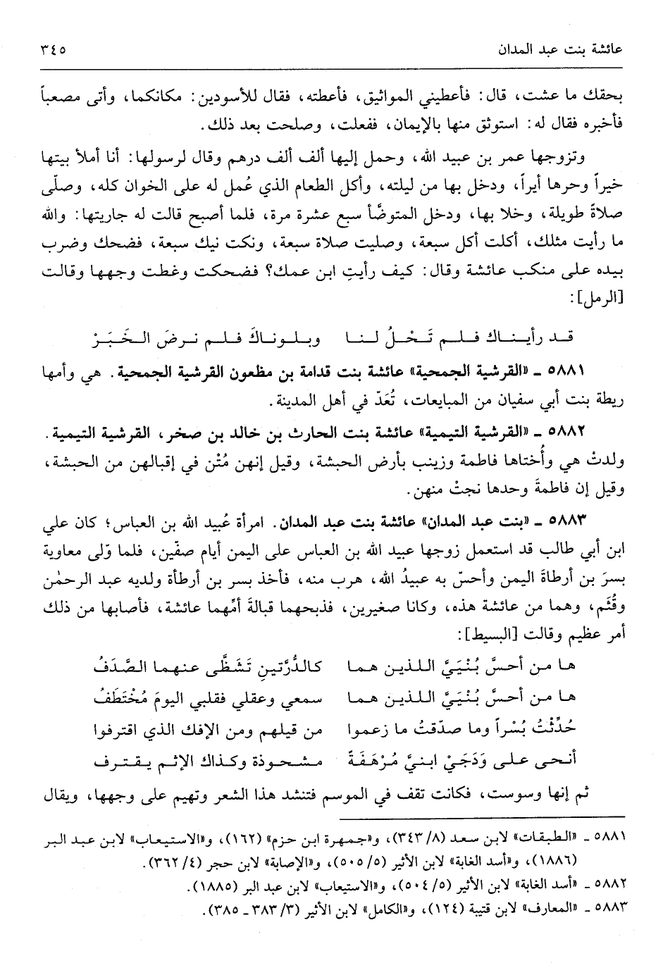 عَائِشَة بنت عبد المدان امْرَأَة عبيد الله بن الْعَبَّاس كَانَ عَليّ بن أبي طَالب قد اسْتعْمل زَوجهَا عبيد الله بن الْعَبَّاس على الْيمن أَيَّام صفّين فَلَمَّا ولى مُعَاوِيَة بسر بن أَرْطَاة الْيمن وأحس بِهِ عبيد الله هرب مِنْهُ فَأخذ بسر بن أَرْطَأَة ولديه عبد الرَّحْمَن وَقثم وهما من عَائِشَة هَذِه وَكَانَا صغيرين فذبحهما قبالة أمهما عَائِشَة فأصابها من ذَلِك أَمر عَظِيم وَقَالَت الْبَسِيط
