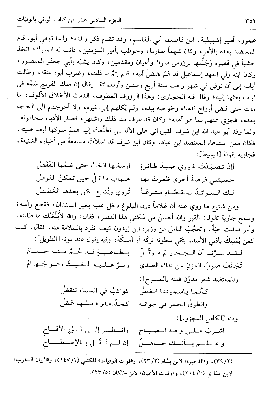 عَمْرو أَمِير إشبيلية ابْن قاضيها أبي الْقَاسِم وَقد تقدم ذكر وَالِده وَلما توفّي أَبوهُ قَامَ المعتضد بعده بِالْأَمر وَكَانَ شهماً صَارِمًا وخوطب بأمير الْمُؤمنِينَ دَانَتْ لَهُ الْمُلُوك اتخذ خشباً فِي قصره وجللها برؤوس مُلُوك وأعيان ومقدمين وَكَانَ يشبه بِأبي جَعْفَر الْمَنْصُور وَكَانَ ابْنه ولي الْعَهْد إِسْمَاعِيل قد هم بِقَبض أَبِيه فَلم يتم لَهُ ذَلِك وَضرب أَبوهُ عُنُقه وطالت أَيَّامه إِلَى أَن توفّي فِي شهر رَجَب سنة أَربع وَسِتِّينَ وَأَرْبَعمِائَة يُقَال إِن ملك الفرنج سمه فِي ثِيَاب بعثها إِلَيْهِ وَقَالَ فِيهِ الحجاري وَهَذَا الرؤوف العطوف الدمث الْأَخْلَاق الألوف مَا مَاتَ حَتَّى قبض أَرْوَاح ندمائه وخواصه بِيَدِهِ وَلم يكلهم إِلَى غَيره وَلَا أحوجهم إِلَى الْحَاجة بعده فجزي عَنْهُم بِمَا هُوَ أَهله وَكَانَ قد عرف مِنْهُ ذَلِك واشتهر فَصَارَ الأدباء يتحامونه وَلما وَفد أَبُو عبد الله ابْن شرف القيرواني على الأندلس تطلعت إِلَيْهِ همم مُلُوكهَا لبعد صيته فَكَانَ مِمَّن استدعاه المعتضد ابْن عباد وَكَانَ ابْن شرف قد امْتَلَأت مسامعه من أخباره الشنيعة فجاوبه بقوله الْبَسِيط