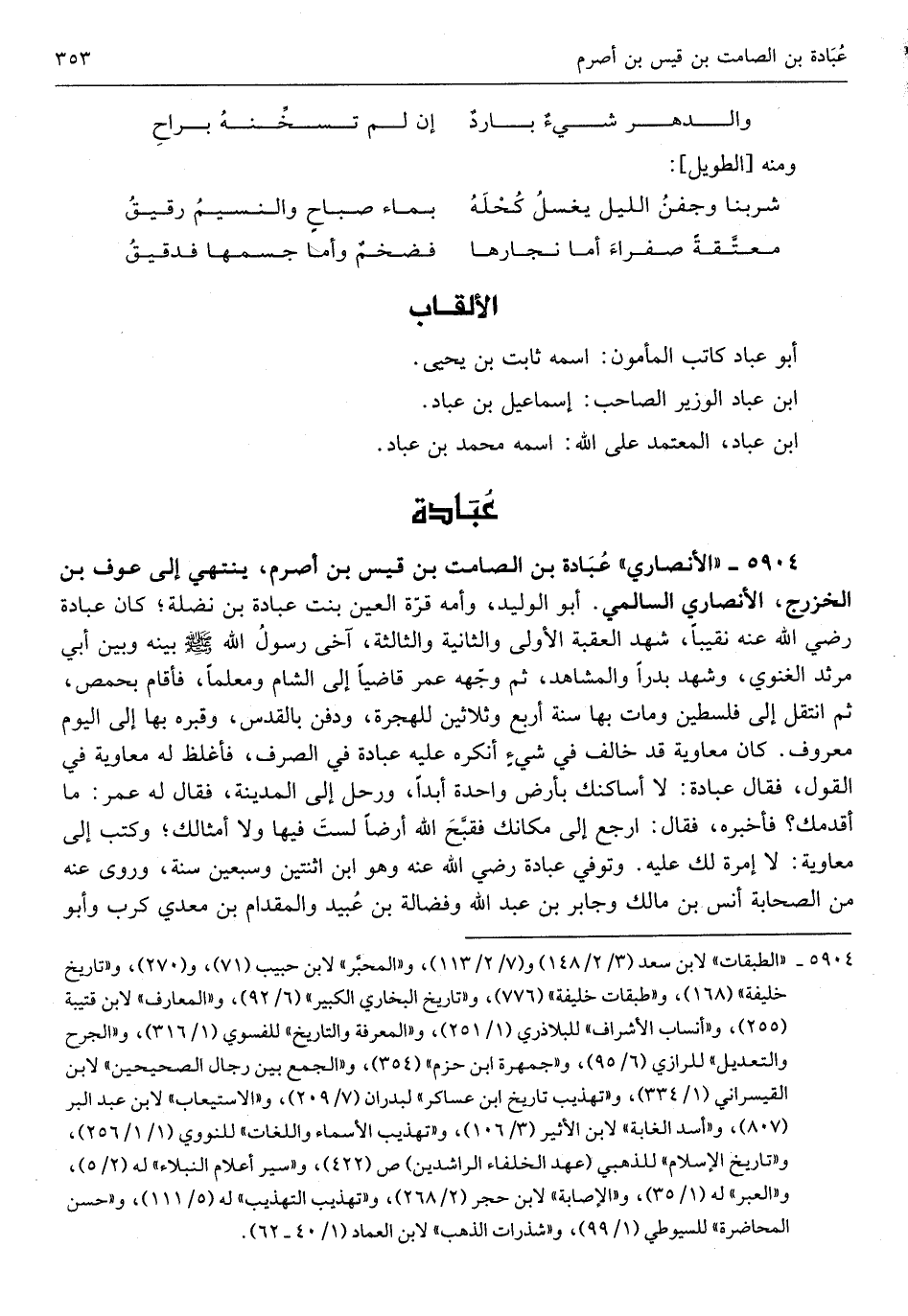 عبَادَة بن الصَّامِت بن قيس بن أَصْرَم يَنْتَهِي إِلَى عَوْف بن الْخَزْرَج الْأنْصَارِيّ السالمي أَبُو الْوَلِيد وَأمه قُرَّة الْعين بنت عبَادَة بن نَضْلَة كَانَ عبَادَة رَضِي الله عَنهُ نَقِيبًا شهد الْعقبَة الأولى وَالثَّانيَِة وَالثَّالِثَة آخى رَسُول الله صلى الله عَلَيْهِ وَسلم بَينه وَبَين أبي مرْثَد الغنوي وَشهد بَدْرًا والمشاهد ثمَّ وَجهه عمر قَاضِيا إِلَى الشَّام ومعلماً فَأَقَامَ بحمص ثمَّ انْتقل إِلَى فلسطين وَمَات بهَا سنة أَربع وَثَلَاثِينَ لِلْهِجْرَةِ وَدفن بالقدس وقبره بهَا إِلَى الْيَوْم مَعْرُوف كَانَ مُعَاوِيَة قد خَالف فِي شَيْء أنكرهُ عَلَيْهِ عبَادَة فِي الصّرْف فَأَغْلَظ لَهُ مُعَاوِيَة فِي القَوْل فَقَالَ عبَادَة لَا أساكنك بِأَرْض وَاحِدَة أبدا ورحل إِلَى الْمَدِينَة فَقَالَ لَهُ عمر مَا أقدمك فَأخْبرهُ فَقَالَ ارْجع إِلَى مَكَانك فقبح الله أَرضًا لست فِيهَا وَلَا أمثالك وَكتب إِلَى مُعَاوِيَة لَا إمرة لَك عَلَيْهِ وَتُوفِّي عبَادَة رَضِي الله عَنهُ وَهُوَ ابْن اثْنَتَيْنِ وَسبعين سنة وروى عَنهُ من الصَّحَابَة أنس بن مَالك وَجَابِر بن عبد الله وفضالة بن عبيد والمقدام بن معدي كرب وَأَبُو