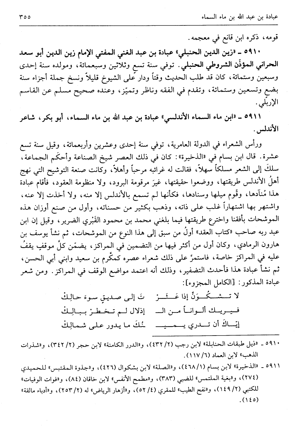عبَادَة بن عبد الله بن مَاء السَّمَاء أَبُو بكر شَاعِر الأندلس وَرَأس الشُّعَرَاء فِي الدولة العامرية توفّي سنة إِحْدَى وَعشْرين وَأَرْبَعمِائَة وَقيل سنة تسع عشرَة قَالَ ابْن بسام فِي الذَّخِيرَة كَانَ فِي ذَلِك الْعَصْر شيخ الصِّنَاعَة وَأحكم الْجَمَاعَة سلك إِلَى الشّعْر مسلكاً سهلاً فَقَالَت لَهُ غَرَائِبه مرْحَبًا وَأهلا وَكَانَت صَنْعَة التوشيح الَّتِي نهج أهل الأندلس طريقتها وَوَضَعُوا حَقِيقَتهَا غير مرقومة البرود وَلَا منظومة الْعُقُود فَأَقَامَ عبَادَة هَذَا منآدها وَقوم ميلها وسنادها فَكَأَنَّهَا لم تسمع بالأندلس إِلَّا مِنْهُ وَلَا أخذت إِلَّا عَنهُ واشتهر بهَا اشتهاراً غلب على ذَاته وَذهب بِكَثِير من حَسَنَاته وَأول من صنع أوزان هَذِه الموشحات بأفقنا واخترع طريقتها فِيمَا بَلغنِي مُحَمَّد بن مَحْمُود القبري الضَّرِير وَقيل إِن ابْن عبد ربه صَاحب كتاب العقد أول من سبق إِلَى هَذَا النَّوْع من الموشحات ثمَّ نَشأ يُوسُف بن هَارُون الرَّمَادِي وَكَانَ أول من أَكثر فِيهَا من التَّضْمِين فِي المراكز يضمن كل موقف يقف عَلَيْهِ فِي المراكز خَاصَّة فاستمر)