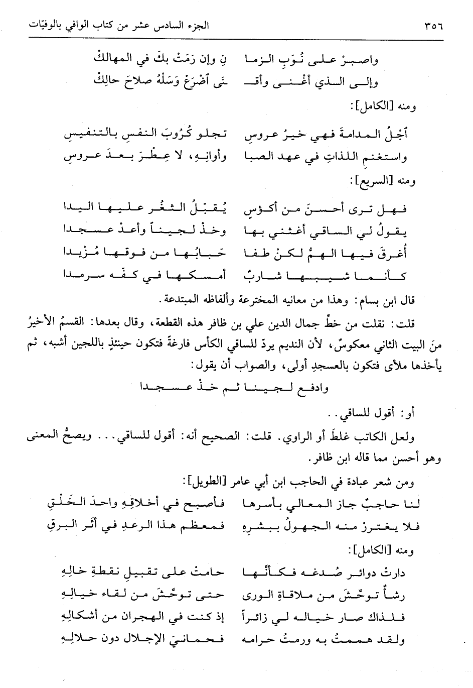 قلت نقلت من خطّ جمال الدّين عَليّ بن ظافر هَذِه الْقطعَة وَقَالَ بعْدهَا الْقسم الْأَخير من الْبَيْت الثَّانِي معكوس لِأَن النديم يرد للساقي الكأس فارغة فَتكون حِينَئِذٍ باللجين أشبه ثمَّ يَأْخُذهَا ملأى فَتكون بالعسجد أولى وَالصَّوَاب أَن يَقُول وادفع لجينا ثمَّ خُذ عسجدا أَو أَقُول للساقي
