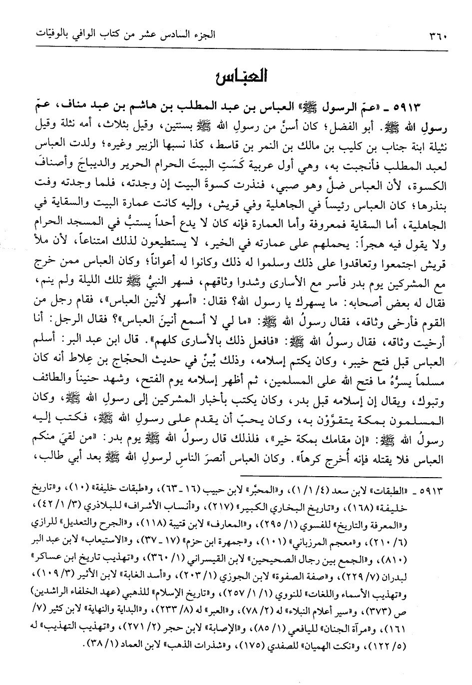 الْعَبَّاس بن عبد الْمطلب بن هَاشم بن عبد منَاف عَم رَسُول الله صلّى الله عَلَيْهِ وسلّم أَبُو الْفضل كَانَ أسن من رَسُول الله صلى الله عَلَيْهِ وَسلم بِسنتَيْنِ وَقيل بِثَلَاث أمه نثلة وَقيل نثيلة ابْنة جناب بن كُلَيْب بن مَالك بن النمر بن قاسط كَذَا نَسَبهَا الزبير وَغَيره ولدت الْعَبَّاس لعبد الْمطلب فأنجبت بِهِ وَهِي أول عَرَبِيَّة كست الْبَيْت الْحَرَام الْحَرِير والديباج وأصناف الْكسْوَة لِأَن الْعَبَّاس ضل وَهُوَ صبي فنذرت كسْوَة الْبَيْت إِن وجدته فَلَمَّا وجدته وفت بنذرها كَانَ الْعَبَّاس رَئِيسا فِي الْجَاهِلِيَّة وَفِي قُرَيْش وَإِلَيْهِ كَانَت عمَارَة الْبَيْت والسقاية فِي الْجَاهِلِيَّة أما السِّقَايَة فمعروفة وَأما الْعِمَارَة فَإِنَّهُ كَانَ لَا يدع أحدا يستب فِي الْمَسْجِد الْحَرَام وَلَا يَقُول فِيهِ هجراً يحملهم على عِمَارَته فِي الْخَيْر لَا يَسْتَطِيعُونَ لذَلِك امتناعاً لِأَن مَلأ قُرَيْش اجْتَمعُوا وتعاقدوا على ذَلِك وسلموا لَهُ ذَلِك وَكَانُوا لَهُ أعواناً وَكَانَ الْعَبَّاس مِمَّن خرج مَعَ الْمُشْركين يَوْم بدر فَأسر مَعَ الْأُسَارَى وشدوا وثاقهم فسهر النَّبِي صلى الله عَلَيْهِ وَسلم تِلْكَ اللَّيْلَة وَلم ينم فَقَالَ لَهُ بعض أَصْحَابه مَا يسهرك يَا رَسُول الله فَقَالَ اسهر لأنين الْعَبَّاس فَقَامَ رجل من الْقَوْم فَأرْخى وثَاقه فَقَالَ رَسُول الله صلى الله عَلَيْهِ وَسلم مَا لي لَا أسمع أَنِين الْعَبَّاس فَقَالَ الرجل أَنا أرخيت وثَاقه فَقَالَ رَسُول الله صلى الله عَلَيْهِ وَسلم فافعل ذَلِك بالأسارى كلهم قَالَ ابْن عبد الْبر أسلم الْعَبَّاس قبل فتح خَيْبَر وَكَانَ يكتم إِسْلَامه وَذَلِكَ بَين فِي حَدِيث الْحجَّاج بن علاط أَنه كَانَ مُسلما يسره مَا فتح الله على الْمُسلمين ثمَّ أظهر إِسْلَامه يَوْم الْفَتْح وَشهد حنيناً والطائف وتبوك وَيُقَال إِن إِسْلَامه قبل بدر وَكَانَ يكْتب بأخبار الْمُشْركين إِلَى رَسُول الله صلى الله عَلَيْهِ وَسلم وَكَانَ الْمُسلمُونَ بِمَكَّة يتقوون بِهِ وَكَانَ يحب أَن يقدم على رَسُول الله)