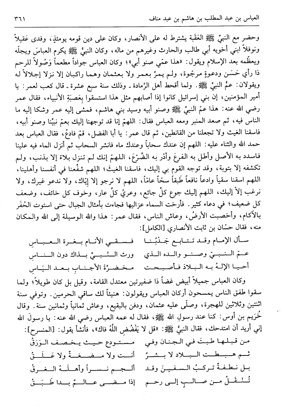 وَحضر مَعَ النَّبِي صلى الله عَلَيْهِ وَسلم الْعقبَة يشْتَرط لَهُ على الْأَنْصَار وَكَانَ على دين قومه يَوْمئِذٍ وفدى عقيلاً ونوفلاً ابْني أَخَوَيْهِ أبي طَالب والْحَارث وَغَيرهم من مَاله وَكَانَ النَّبِي صلى الله عَلَيْهِ وَسلم يكرم الْعَبَّاس ويجله ويعظمه بعد الْإِسْلَام وَيَقُول هَذَا عمي صنو أبي وَكَانَ الْعَبَّاس جواداً مطعماً وصُولا للرحم ذَا رَأْي حسن ودعوة مرجوة وَلم يمر بعمر وَلَا بعثمان وهما راكبان إِلَّا نزلا إجلالاً لَهُ ويقولان عَم النَّبِي صلى الله عَلَيْهِ وَسلم وَلما أقحط أهل الرَّمَادَة وَذَلِكَ سنة سبع عشرَة قَالَ كَعْب لعمر يَا أَمِير الْمُؤمنِينَ إِن بني إِسْرَائِيل كَانُوا إِذا أَصَابَهُم مثل هَذَا استسقوا بعصبة الْأَنْبِيَاء فَقَالَ عمر رَضِي الله عَنهُ هَذَا عَم النَّبِي صلى الله عَلَيْهِ وَسلم وصنو أَبِيه وَسيد بني هَاشم فَمشى إِلَيْهِ عمر وشكا إِلَيْهِ مَا النَّاس فِيهِ ثمَّ صعد الْمِنْبَر وَمَعَهُ الْعَبَّاس فَقَالَ اللَّهُمَّ إِنَّا قد توجهنا إِلَيْك بعم نَبينَا وصنو أَبِيه فاسقنا الْغَيْث وَلَا تجعلنا من القانطين ثمَّ قَالَ عمر يَا أَبَا الْفضل قُم فَادع فَقَالَ الْعَبَّاس بعد حمد الله وَالثنَاء عَلَيْهِ اللَّهُمَّ إِن عنْدك سحاباً وعندك مَاء فانشر السَّحَاب ثمَّ أنزل المَاء فِيهِ علينا فاسدد بِهِ الأَصْل واطل بِهِ الْفَرْع وادر بِهِ الضَّرع اللَّهُمَّ إِنَّك لم تنزل بلَاء إِلَّا بذنب وَلم تكشفه إِلَّا بتوبة وَقد توجه الْقَوْم بِي إِلَيْك فاسقنا الْغَيْث اللَّهُمَّ شفعنا فِي أَنْفُسنَا وأهلينا اللَّهُمَّ اسقنا سقيا وادعاً نَافِعًا طبقًا سَحا عَاما اللَّهُمَّ لَا نرجو إِلَّا إياك وَلَا نَدْعُو غَيْرك وَلَا نرغب إِلَّا إِلَيْك اللَّهُمَّ إِلَيْك جوع كل جَائِع وعري كل عَار وَخَوف كل خَائِف وَضعف كل ضَعِيف فِي دُعَاء كثير فَأَرختْ السَّمَاء عزاليها فَجَاءَت بأمثال الْجبَال حَتَّى اسْتَوَت الْحفر بالآكام وأخصبت الأَرْض وعاش النَّاس فَقَالَ عمر هَذَا وَالله الْوَسِيلَة إِلَى الله وَالْمَكَان مِنْهُ فَقَالَ حسان بن ثَابت الْأنْصَارِيّ الْكَامِل