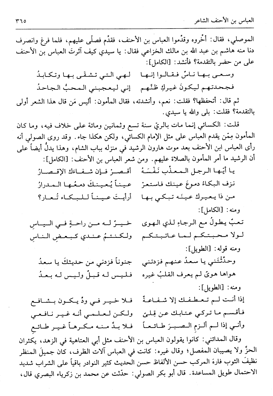 ثمَّ قَالَ أتحفظها فَقلت نعم وأنشدته فَقَالَ الْمَأْمُون أَلَيْسَ من قَالَ هَذَا الشّعْر أولى بالتقدمة فَقلت بلَى وَالله يَا سَيِّدي قلت الْكسَائي إِنَّمَا مَاتَ بِالريِّ سنة تسع وَثَمَانِينَ وَمِائَة على خلاف فِيهِ وَمَا كَانَ الْمَأْمُون مِمَّن يقدم الْعَبَّاس على مثل الإِمَام الْكسَائي وَلَكِن هَكَذَا جَاءَ وَقد روى الصولي أَنه رأى الْعَبَّاس ابْن الْأَحْنَف بعد موت هَارُون الرشيد فِي منزله بِبَاب الشَّام وَهَذَا يدل أَيْضا على أَن الرشيد مَا أَمر الْمَأْمُون بِالصَّلَاةِ عَلَيْهِم وَمن شعر الْعَبَّاس بن الْأَحْنَف الْكَامِل