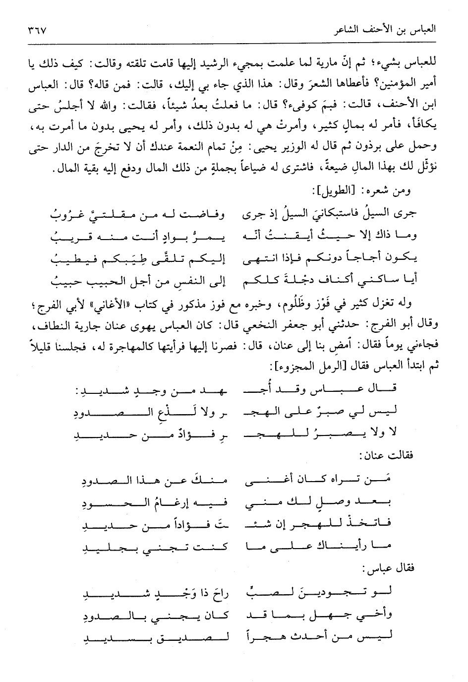 للْعَبَّاس بِشَيْء ثمَّ إِن مَارِيَة لما علمت بمجيء الرشيد إِلَيْهَا قَامَت تَلَقَّتْهُ وَقَالَت كَيفَ ذَلِك يَا أَمِير الْمُؤمنِينَ فَأَعْطَاهَا الشّعْر وَقَالَ هَذَا الَّذِي جَاءَ بِي إِلَيْك قَالَت فَمن قَالَه قَالَ الْعَبَّاس بن الْأَحْنَف قَالَت فَبِمَ كوفئ قَالَ مَا فعلت بعد شَيْئا فَقَالَت وَالله لَا أَجْلِس حَتَّى يكافأ فَأمر لَهُ بِمَال كثير وَأمرت هِيَ لَهُ بِدُونِ ذَلِك وَأمر لَهُ يحيى بِدُونِ مَا أمرت بِهِ وَحمل على برذون ثمَّ قَالَ لَهُ الْوَزير يحيى من تَمام النِّعْمَة عنْدك أَن لَا تخرج من الدَّار حَتَّى نؤثل لَك بِهَذَا المَال ضَيْعَة فَاشْترى لَهُ ضيَاعًا بجملة من ذَلِك المَال وَدفع إِلَيْهِ بَقِيَّة المَال