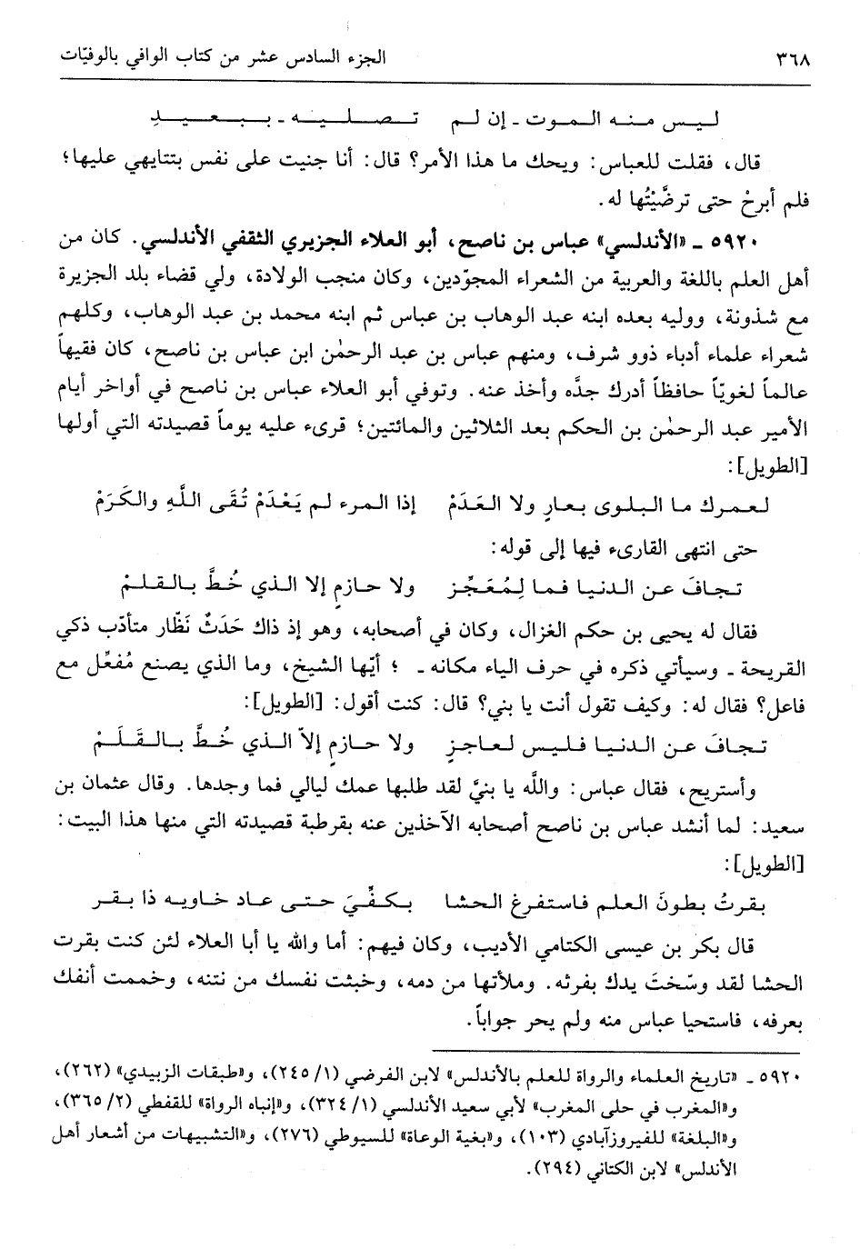 وأستريح فَقَالَ عَبَّاس وَالله يَا بني لقد طلبَهَا عمك ليَالِي فَمَا وجدهَا وَقَالَ عُثْمَان بن سعيد لما أنْشد عَبَّاس بن نَاصح أَصْحَابه الآخذين عَنهُ بقرطبة قصيدته الَّتِي مِنْهَا هَذَا الْبَيْت الطَّوِيل