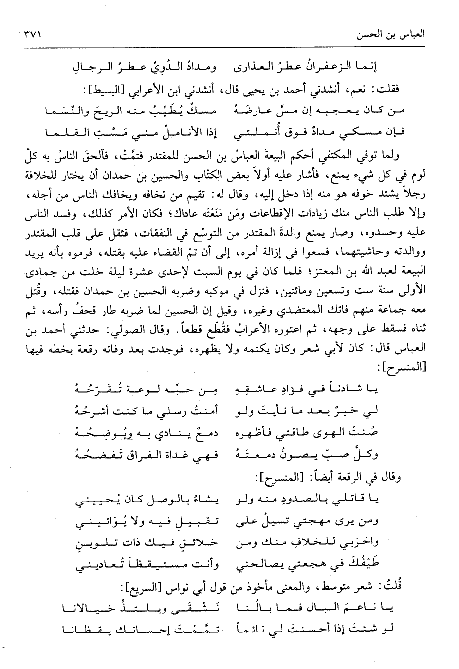 وَلما توفّي المكتفي أحكم الْبيعَة الْعَبَّاس بن الْحسن للمقتدر فتمت فَألْحق النَّاس بِهِ كل لوم فِي كل شَيْء يمْنَع فَأَشَارَ عَلَيْهِ أَولا بعض الْكتاب وَالْحُسَيْن ابْن حمدَان أَن يخْتَار للخلافة رجلا يشْتَد خَوفه هُوَ مِنْهُ إِذا دخل إِلَيْهِ وَقَالَ لَهُ تقيم من تخافه ويخافك النَّاس من أَجله وَإِلَّا طلب النَّاس مِنْك زيادات الإقطاعات وَمن منعته عاداك فَكَانَ الْأَمر كَذَلِك وَفَسَد النَّاس عَلَيْهِ وحسدوه وَصَارَ يمْنَع وَالِدَة المقتدر من التَّوَسُّع فِي النَّفَقَات فثقل على قلب المقتدر ووالدته وحاشيتهما فسعوا فِي إِزَالَة أمره إِلَى أَن تمّ الْقَضَاء عَلَيْهِ بقتْله فَرَمَوْهُ بِأَنَّهُ يُرِيد الْبيعَة لعبد الله بن المعتز فَلَمَّا كَانَ فِي يَوْم السبت لإحدى عشرَة لَيْلَة خلت من جُمَادَى الأولى سنة سِتّ وَتِسْعين وَمِائَتَيْنِ فَنزل فِي موكبه وضربه الْحُسَيْن بن حمدَان فَقتله وَقتل مَعَه جمَاعَة مِنْهُم فاتك المعتضدي وَغَيره وَقيل إِن الْحُسَيْن لما ضربه طَار قحف رَأسه ثمَّ ثناه فَسقط على وَجهه ثمَّ اعتوره الْأَعْرَاب فَقطع قطعا وَقَالَ الصولي حَدثنِي أَحْمد بن الْعَبَّاس قَالَ كَانَ لأبي شعر وَكَانَ يَكْتُمهُ وَلَا يظهره فَوجدت بعد وَفَاته رقْعَة بِخَطِّهِ فِيهَا المنسرح