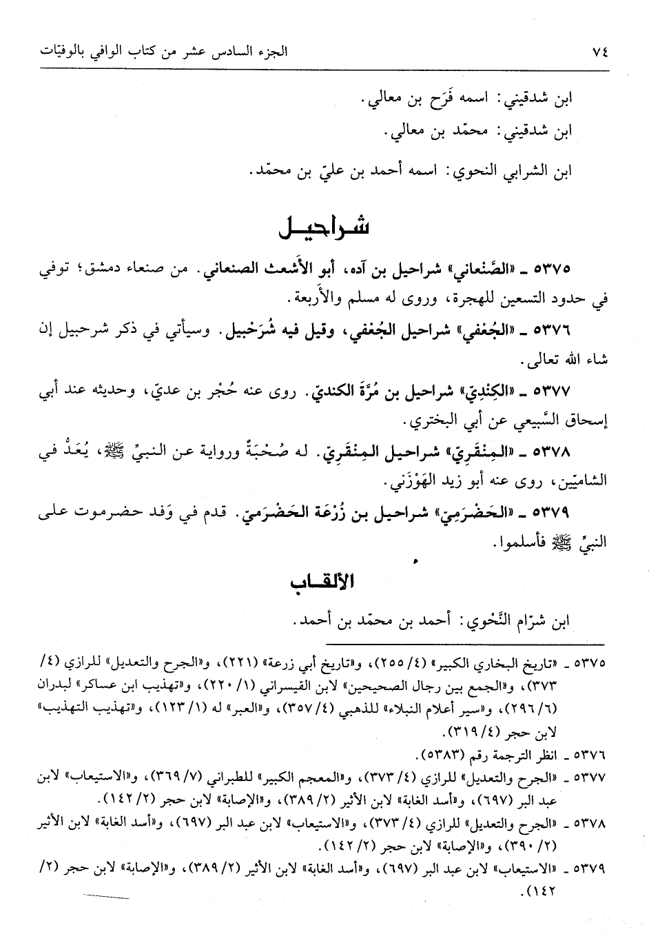 شرَاحِيل بن آده أَبُو الْأَشْعَث الصَّنْعَانِيّ من صنعاء دمشق توفّي فِي حُدُود التسعين لِلْهِجْرَةِ وروى لَهُ مُسلم وَالْأَرْبَعَة