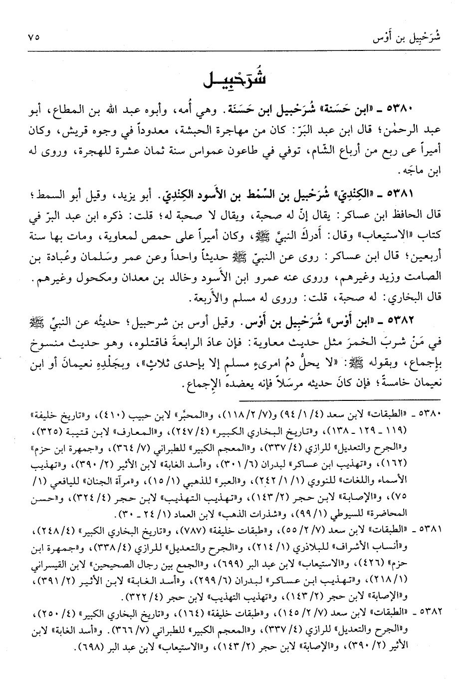 شُرَحْبِيل ابْن حَسَنَة وَهِي أمه وَأَبوهُ عبد الله بن المطاع أَبُو عبد الرَّحْمَن قَالَ ابْن عبد الْبر كَانَ من مهاجرة الْحَبَشَة معدوداً فِي وُجُوه قُرَيْش وَكَانَ أَمِيرا على ربع من أَربَاع الشَّام توفّي فِي طاعون عمواس سنة ثَمَان عشرَة لِلْهِجْرَةِ وروى لَهُ ابْن مَاجَه