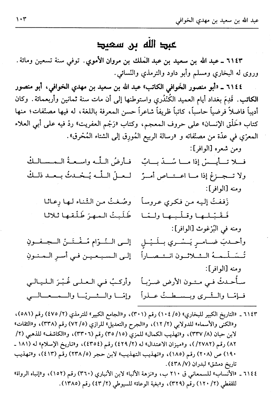 أَبُو مَنْصُور الخوافي الْكَاتِب عبد الله بن سعيد بن مهْدي الخوافي أَبُو مَنْصُور الْكَاتِب قدم بَغْدَاد أَيَّام العميد الكندري واستوطنها إِلَى أَن مَاتَ سنة ثَمَانِينَ وَأَرْبَعمِائَة وَكَانَ أديباً فَاضلا فرضياً حاسباً كَاتبا ظريفاً شَاعِرًا حسن الْمعرفَة باللغة لَهُ فِيهَا مصنفات مِنْهَا كتاب خلق الْإِنْسَان على حُرُوف المعجم وَكتاب رجم العفريت رد فِيهِ على أبي الْعَلَاء المعري فِي عدَّة من مصنفاته ورسالة الرّبيع المورق إِلَى الشتَاء المحرق