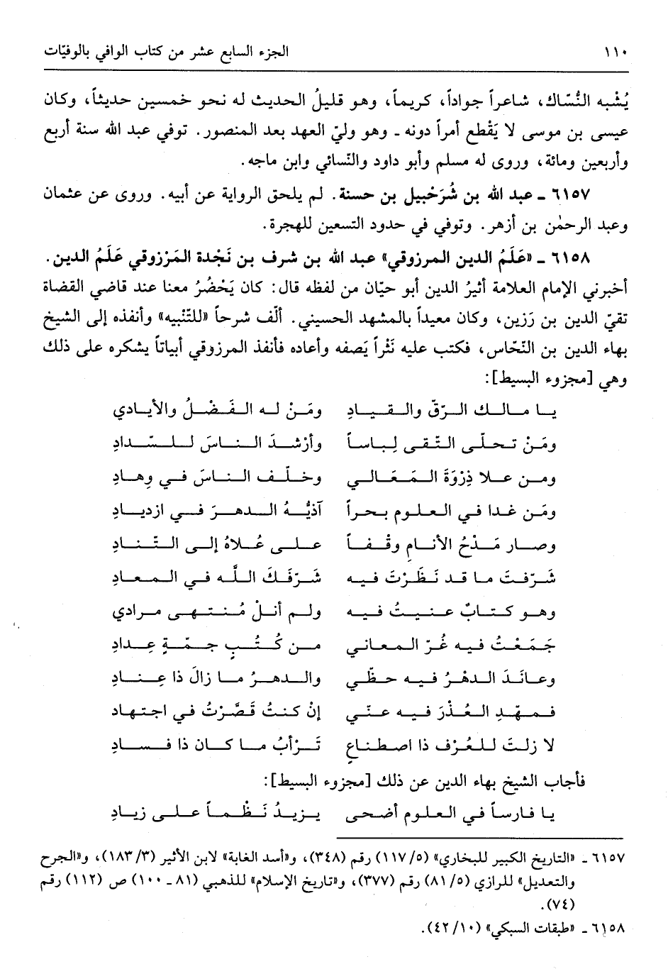 علم الدّين المرزوقي عبد الله بن شرف بن نجدة المرزوقي علم الدّين أخيرني الإِمَام العلاّمة أثير الدّين أَبُو حَيَّان من لَفظه قَالَ كَانَ يحضر مَعنا عِنْد قَاضِي الْقُضَاة تَقِيّ الدّين بن رزين وَكَانَ معيداً بالمشهد الْحُسَيْنِي ألف شرحاً للتّنْبِيه وأنفذه إِلَى الشَّيْخ بهاء الدّين بن النّحاس فَكتب عَلَيْهِ نشراً يصفه وَأَعَادَهُ فأنفذ المرزوقي أبياتاً يشكره على ذَلِك وَهِي من مجزوء الْبَسِيط