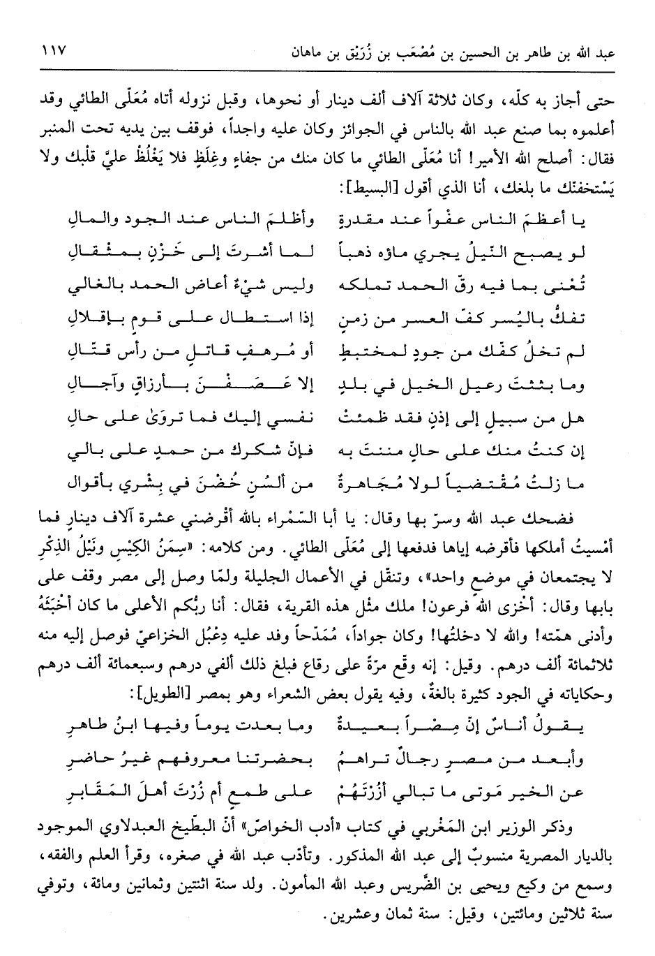 فَضَحِك عبد الله وسر بهَا وَقَالَ يَا أَبَا السمراء بِاللَّه أَقْرضنِي عشرَة آلَاف دِينَار فَمَا أمسيت أملكهَا فأقرضه إِيَّاهَا فَدَفعهَا إِلَى مُعلى الطَّائِي وَمن كَلَامه سمن الْكيس ونيل الذّكر لَا يَجْتَمِعَانِ فِي موضعٍ واحدْ وتنقل فِي الاعمال الجليلة وَلما وصل إِلَى مصر وقف على بَابهَا وَقَالَ أخزى الله فِرْعَوْن ملك مثل هَذِه الْقرْيَة فَقَالَ أَنا ربكُم الْأَعْلَى مَا كَانَ أخبثه وَأدنى همته وَالله لَا دَخَلتهَا وَكَانَ جواداً ممدحاً وَفد عَلَيْهِ دعبل الْخُزَاعِيّ فوصل إِلَيْهِ مِنْهُ ثَلَاث مائَة ألف دِرْهَم وَقيل إِنَّه وَقع مرّة على رقاع فَبلغ ذَلِك ألفي ألف دِرْهَم وَسَبْعمائة ألف دِرْهَم