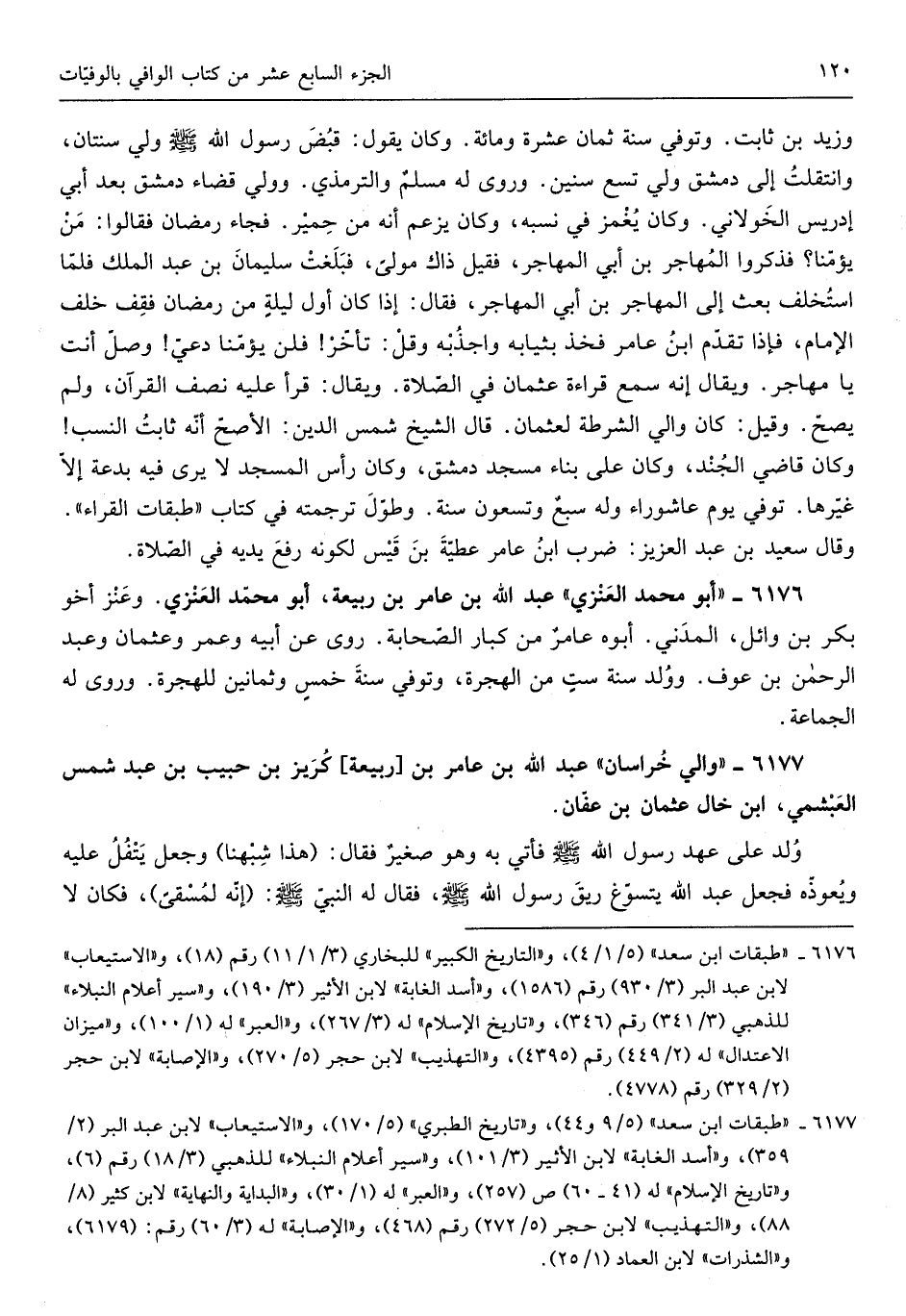 وَزيد بن ثَابت وَتُوفِّي سنة ثَمَان عشرَة وَمِائَة وَكَانَ يَقُول قبض رَسُول الله صلى الله عَلَيْهِ وَسلم ولي سنتَانِ وانتقلت إِلَى دمشق ولي تسع سِنِين وروى لَهُ مسلمٌ وَالتِّرْمِذِيّ وَولي قَضَاء دمشق بعد أبي إِدْرِيس الْخَولَانِيّ وَكَانَ يغمز فِي نسبه وَكَانَ يزْعم أَنه من حمير فجَاء رَمَضَان فَقَالُوا من يؤمنا فَذكرُوا المُهَاجر بن أبي المُهَاجر فَقيل ذَاك مولى فبلغت سُلَيْمَان بن عبد الْملك فَلَمَّا اسْتخْلف بعث إِلَى المُهَاجر بن أبي المُهَاجر فَقَالَ إِذا كَانَ أول لَيْلَة من رَمَضَان فقف خلف الإِمَام فَإِذا تقدم ابْن عَامر فَخذ بثيابه واجذبه وَقل تَأَخّر فَلَنْ يؤمنا دعِي وصل أَنْت يَا مهَاجر وَيُقَال إِنَّه سمع قِرَاءَة عُثْمَان فِي الصَّلَاة وَيُقَال قَرَأَ عَلَيْهِ نصف الْقُرْآن وَلم يَصح وَقيل كَانَ وَالِي الشرطة لعُثْمَان قَالَ الشَّيْخ شمس الدّين الْأَصَح أَنه ثَابت النّسَب وَكَانَ قَاضِي الْجند وَكَانَ على بِنَاء مَسْجِد دمشق وَكَانَ رَأس الْمَسْجِد لايرى فِيهِ بِدعَة إِلَّا غَيرهَا توفّي يَوْم عَاشُورَاء وَله سبع وَتسْعُونَ سنة وَطول تَرْجَمته فيكتاب طَبَقَات الْقُرَّاء وَقَالَ سعيد بن عبد الْعَزِيز ضرب ابْن عامرعطية بن قيس لكَونه رفع يَدَيْهِ فِي الصَّلَاة
