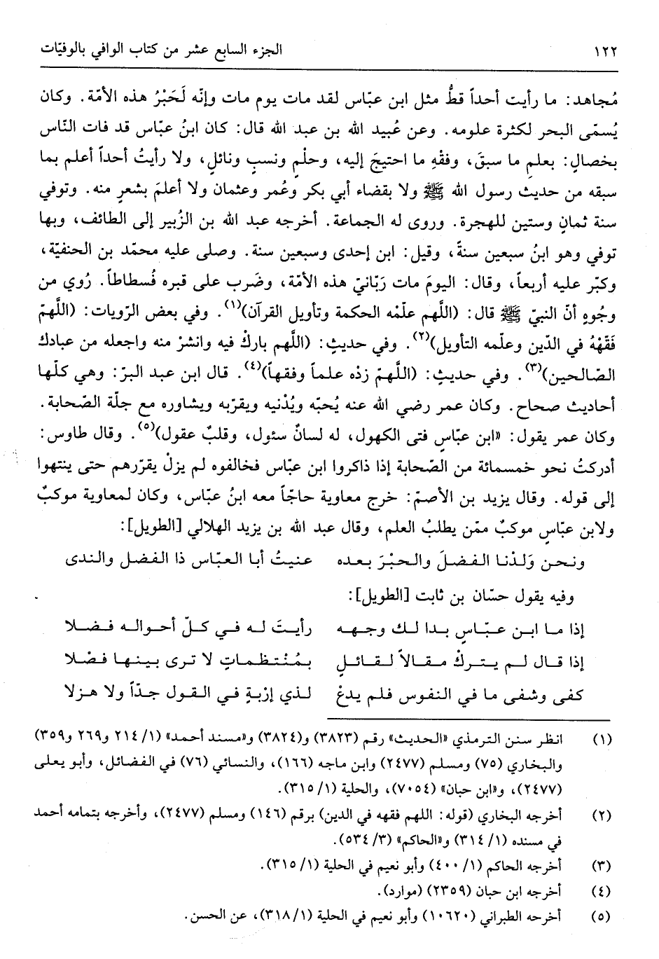 مُجَاهِد مارأيت أحدا قطّ مثل ابْن عَبَّاس لقد مَاتَ يَوْم مَاتَ وَإنَّهُ لحبر هَذِه الْأمة وَكَانَ يُسمى الْبَحْر لِكَثْرَة علومه وَعَن عبيد الله بن عبد الله قَالَ كَانَ ابْن عَبَّاس قد فَاتَ النَّاس بخصالٍ بِعلم مَا سبق وَفقه مَا احْتِيجَ إِلَيْهِ وحلمٍ ونسبٍ ونائلٍ وَلَا رَأَيْت أحدا أعلم بِمَا سبقه من حَدِيث رَسُول الله صلى الله عَلَيْهِ وَسلم وَلَا بِقَضَاء أبي بكر وَعَمْرو وَعُثْمَان وَلَا أعلم بشعرٍ مِنْهُ وَتُوفِّي سنة ثمانٍ وَسِتِّينَ لِلْهِجْرَةِ وروى لَهُ الْجَمَاعَة أخرجه عبد الله ابْن الزبير إِلَى الطَّائِف وَبهَا توفّي وَهُوَ ابْن سبعين سنة وَقيل ابْن إِحْدَى وَسبعين سنة وَصلى عَلَيْهِ مُحَمَّد بن الْحَنَفِيَّة وَكبر عَلَيْهِ أَرْبعا وَقَالَ الْيَوْم مَاتَ رباني هَذِه الْأمة وَضرب على قَبره فسطاطاً