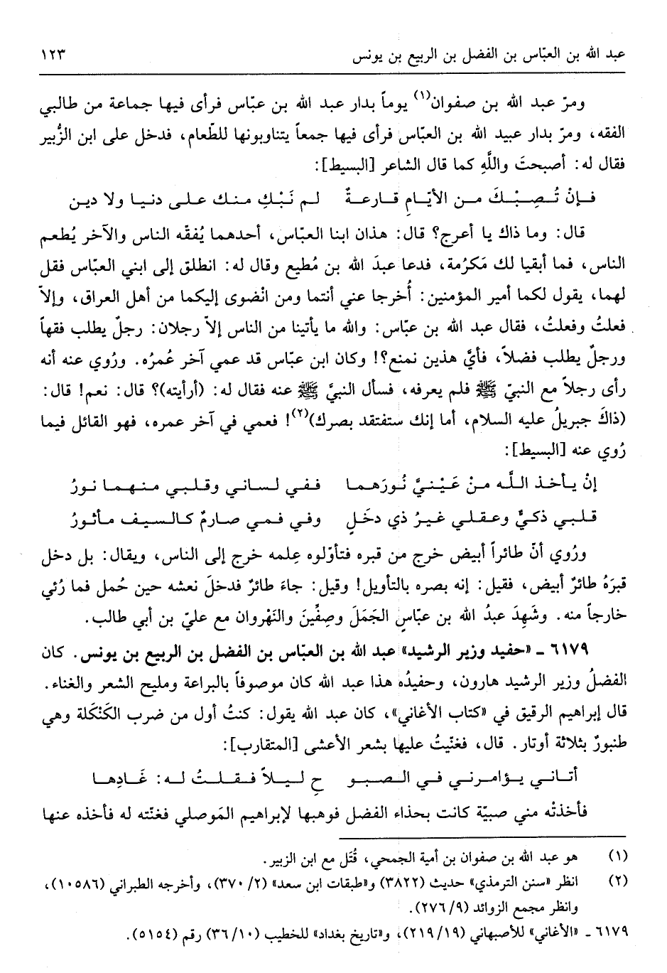 قَالَ وماذاك يَا أعرج قَالَ هَذَانِ ابْنا الْعَبَّاس أَحدهمَا يفقه النَّاس وَالْآخر يطعم النَّاس فَمَا أبقيا ذَلِك لَك مكرمَة فَدَعَا عبد الله بن مُطِيع وَقَالَ لَهُ إنطلق إِلَى ابْني عَبَّاس فَقل لَهما يَقُول لَكمَا أَمِير الْمُؤمنِينَ أخرجَا عني أَنْتُمَا وَمن انضوى إلَيْكُمَا من أهل الْعرَاق وَإِلَّا فعلت وَفعلت فَقَالَ عبد الله بن عَبَّاس وَالله مَا يأتينا من النَّاس إِلَّا رجلَانِ رجل يطْلب فقهاً ورجلٌ يطْلب فضلا فَأَي هذَيْن نمْنَع وَكَانَ ابْن عَبَّاس قد عمي آخر عمره وَرُوِيَ عَنهُ أَنه رأى رجلا مَعَ النَّبِي صلى الله عَلَيْهِ وَسلم فَلم يعرفهُ فَسَأَلَ النَّبِي صلى الله عَلَيْهِ وَسلم عَنهُ فَقَالَ لَهُ أرأيته قَالَ نعم قَالَ ذَاك جِبْرِيل عَلَيْهِ السَّلَام أما إِنَّك ستفتقد بَصرك فَعميَ فِي آخر عمره فَهُوَ الْقَائِل فِيمَا رُوِيَ عَنهُ من الْبَسِيط
