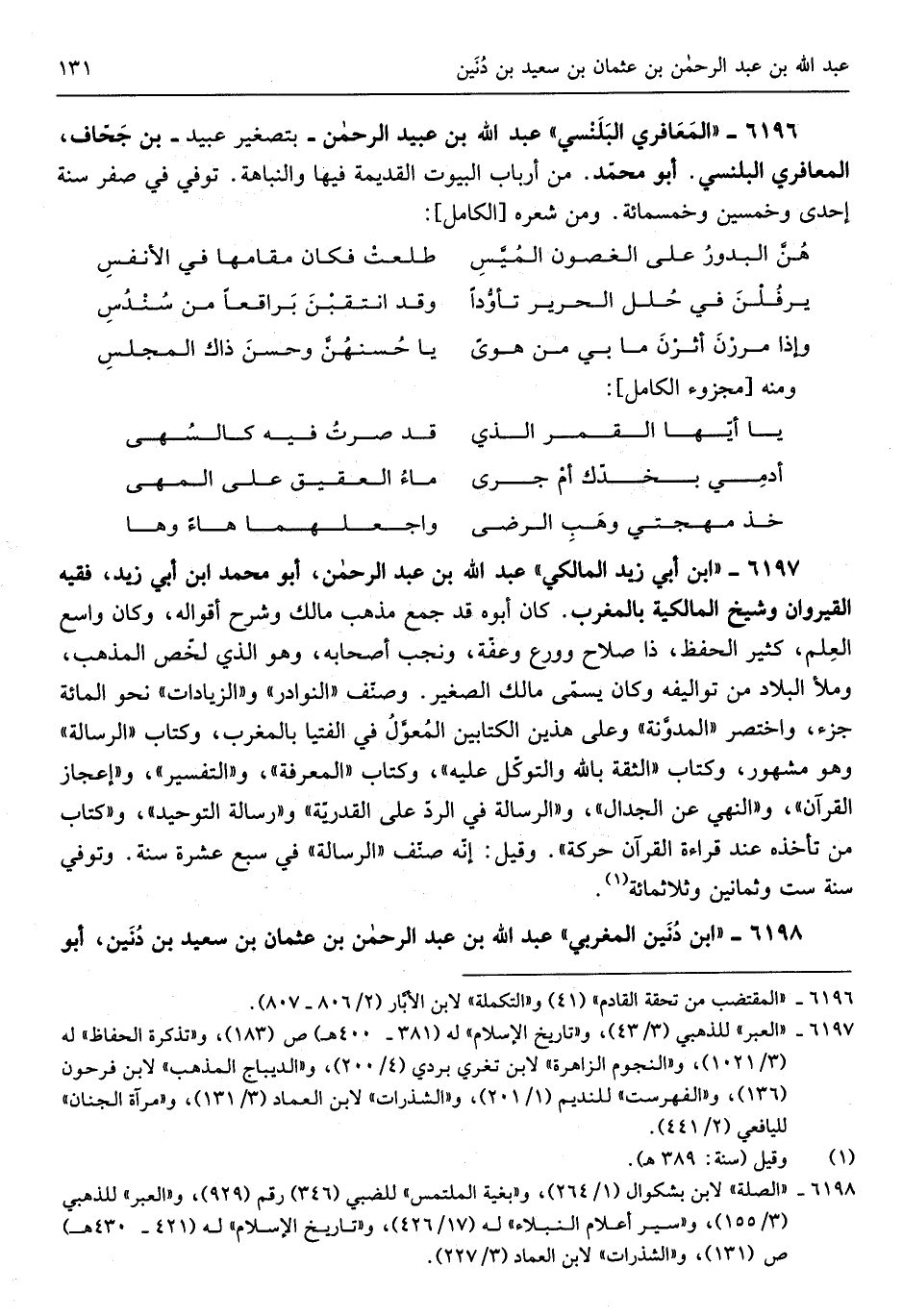 الْمعَافِرِي البلنسي عبد الله بن عبيد الرحمان بتصغير عبيد بن جحاف الْمعَافِرِي البلنسي أَبُو مُحَمَّد من أَرْبَاب الْبيُوت الْقَدِيمَة فِيهَا والنباهة توفّي فِي صفر سنة إِحْدَى وَخمسين وَخَمْسمِائة وَمن شعره من الْكَامِل