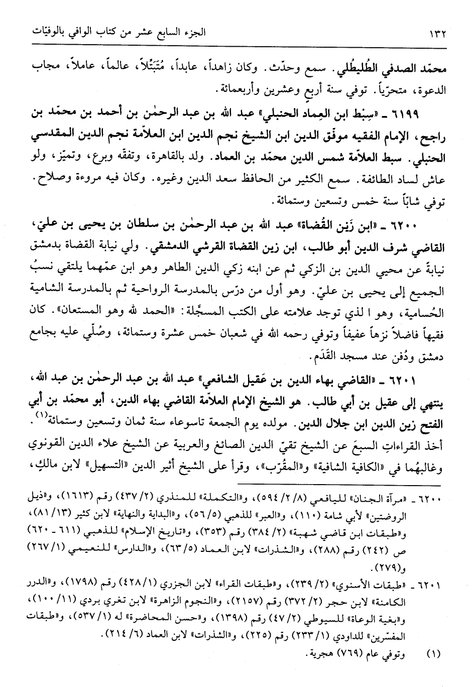 القَاضِي بهاء الدّين بن عقيل الشَّافِعِي عبد الله بن عبد الرحمان بن عبد الله يَنْتَهِي إِلَى عقيل بن أبي طَالب هُوَ الشَّيْخ الإِمَام الْعَلامَة القَاضِي بهاء الدّين أَبُو مُحَمَّد بن أبي الْفَتْح زين الدّين ابْن جلال الدّين مولده يَوْم الْجُمُعَة تاسوعاء سنة ثَمَان وَتِسْعين وسِتمِائَة أَخذ القراآت السَّبع عَن الشَّيْخ تَقِيّ الدّين الصَّائِغ والعربية)
