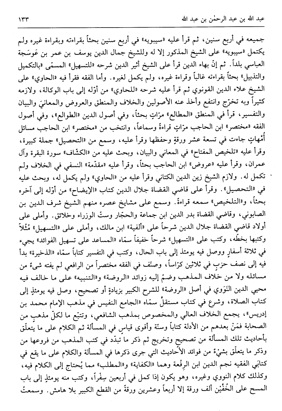 وَقَرَأَ على قَاضِي الْقُضَاة جلال الدّين كتاب الْإِيضَاح من أَوله إِلَى آخِره بحثا وَالتَّلْخِيص سَمعه قِرَاءَة وَسمع على مَشَايِخ عصره مِنْهُم الشَّيْخ شرف الدّين بن الصَّابُونِي وقاضي الْقُضَاة بدر الدّين ابْن جمَاعَة والحجار وست الوزراء وخلائق وأملى على أَوْلَاد قَاضِي الْقُضَاة جلال الدّين شرحاً على ألفية ابْن مَالك وأملى على التسهيل مثلا وكتبها بِخَطِّهِ وَكتب على التسهيل شرحاً خَفِيفا سَمَّاهُ المساعد على تسهيل الْفَوَائِد يَجِيء فِي ثَلَاثَة أسفارٍ وَوصل فِيهِ يَوْمئِذٍ إِلَى بَاب الْحَال وَكتب فِي التَّفْسِير كتابا سَمَّاهُ الذَّخِيرَة بَدَأَ فِيهِ إِلَى نصف حزبٍ فِي ثَلَاثِينَ كراساً وصنف فِي الْفِقْه مُخْتَصرا من الرَّافِعِيّ لم يفته شيءٌ من مسَائِله ولامن خلاف الْمَذْهَب وَضم إِلَيْهِ زَوَائِد الرَّوْضَة والتنبيه على مَا خَالف فِيهِ محيي الدّين النَّوَوِيّ فِي أصل الرَّوْضَة للشرح الْكَبِير بزيادةٍ أَو تَصْحِيح وصل فِيهِ يومئذٍ إِلَى كتاب الصَّلَاة وَشرع فِي كتاب مستقلٍّ سَمَّاهُ الْجَامِع النفيس فِي مَذْهَب الإِمَام مُحَمَّد بن إِدْرِيس يجمع الْخلاف العالي والمخصوص بِمذهب الشَّافِعِي وتتبع مَا لكل مذهبٍ من الصَّحَابَة فَمن بعدهمْ من الْأَدِلَّة كتابا وَسنة وَأقوى قياسٍ فِي الْمَسْأَلَة ثمَّ الْكَلَام على مَا يتَعَلَّق بِأَحَادِيث تِلْكَ الْمَسْأَلَة من تصحيحٍ وَتَخْرِيج ثمَّ ذكر مَا تبدد فِي)